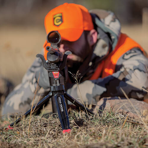 Kompaktowa podpórka strzelecka w formie trójnogu. Umożliwia komfortowe podparcie broni i pozostanie w pozycji siedzącej lub leżącej. Posiada regulacje wysokości w zakresie od 17 do 28 centymetrów. Uchwyt jest pokryty gumą i ma kształt litery V, co pozwala na użytkowanie z szeroką gamą broni. Wykonana z frezowanego aluminium i wytrzymałego polimeru. Stopki trójnogu pokryte są gumą, co zwiększa przyczepność nawet na grząskim terenie.