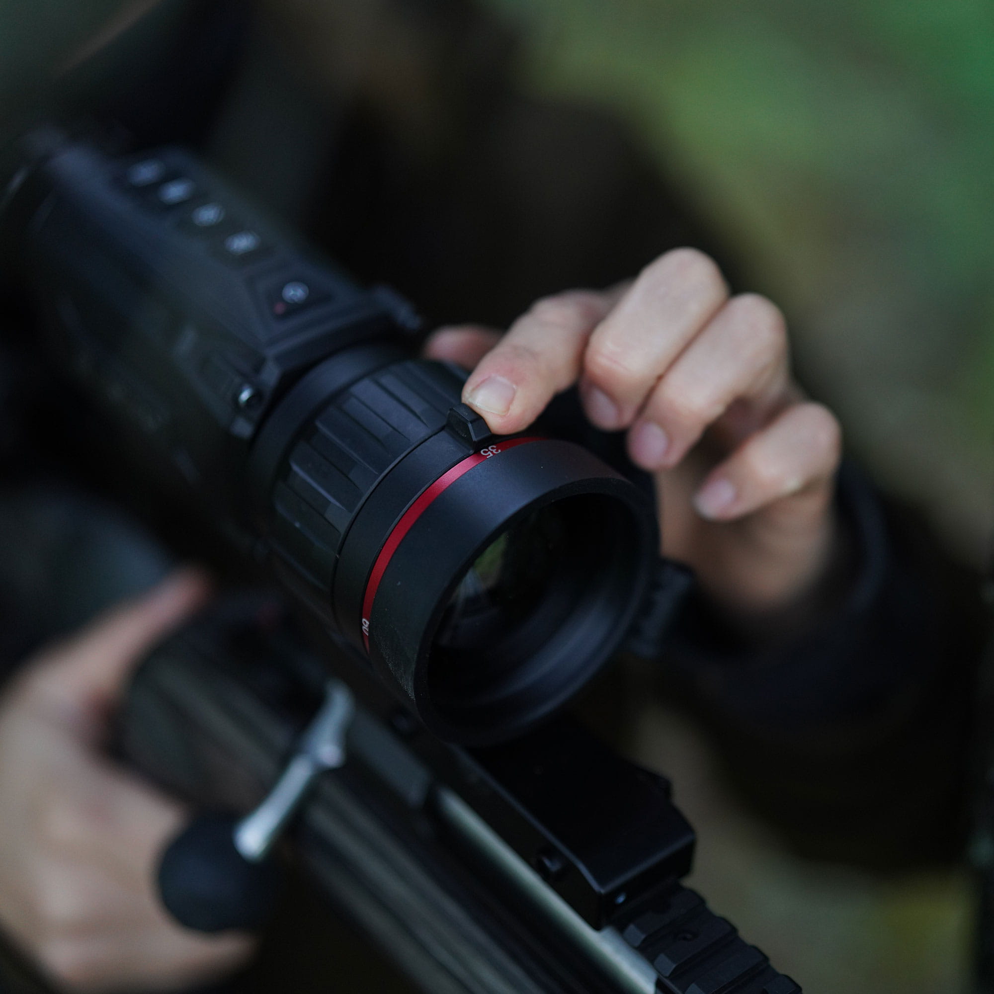 To kluczowa funkcja zwiększająca elastyczność polowania. Ogniskowa 35 mm zapewnia szerokie pole widzenia (FOV), idealne do szybkiego przeszukiwania terenu i strzelania na bliskich dystansach. Przełączenie na 60 mm daje wyższe optyczne powiększenie (3,1X), które jest niezbędne do identyfikacji celu i precyzyjnego strzelania na dalekich dystansach (do 3000 m detekcji).