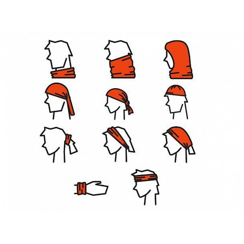 Chusta ma formę bezszwowego komina, który możemy nosić na wiele różnych sposobów m.in. jako szal, czapkę, kaptur, maskę twarzową, opaskę na czoło, gumkę do włosów lub frotkę na nadgarstku do wycierania potu.