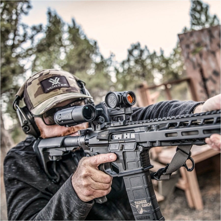 Vortex Micro6x to kompaktowy powiększalnik o 6× powiększeniu, który umożliwia na błyskawiczne przystosowanie karabinka do strzelania na większym dystansie. Vortex Micro6x jest kompatybilny z celownikami kolimatorowymi i holograficznymi.