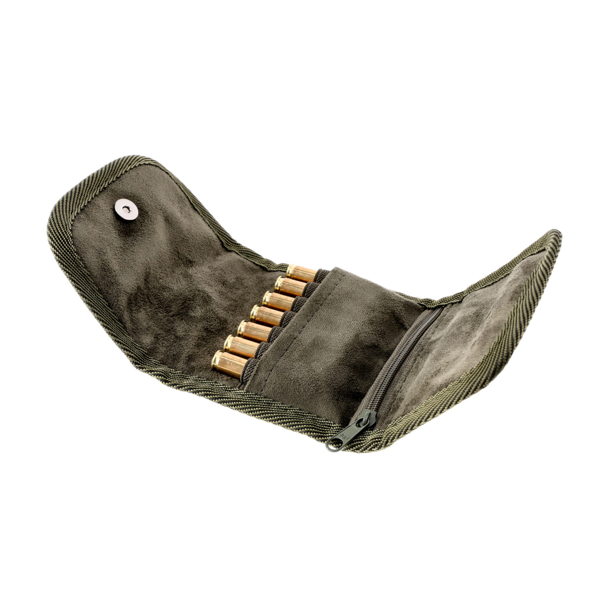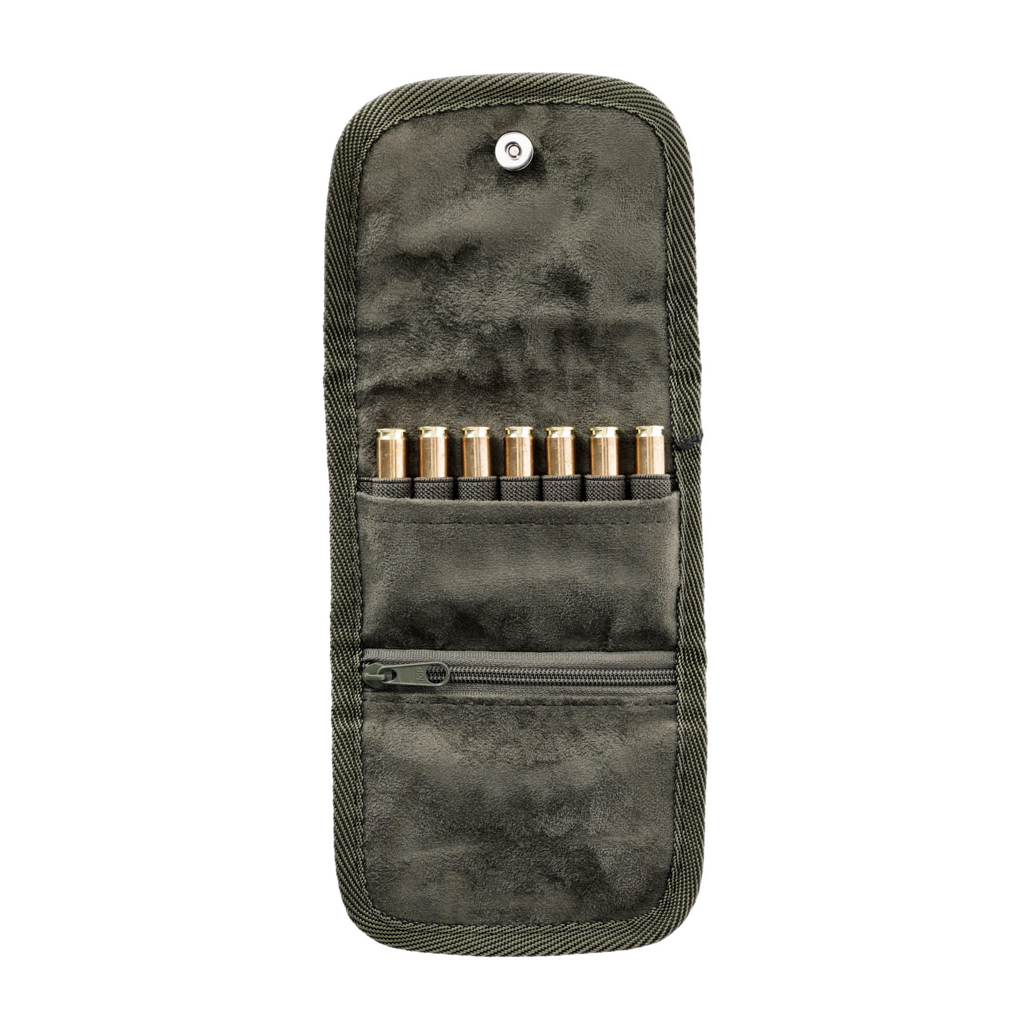 Produkt wyposażono w cichy magnetyczny klips, co umożliwia szybki i dyskretny dostęp do amunicji podczas polowania. Dodatkowo ładownica posiada wewnętrzną kieszeń zapinaną na zamek błyskawiczny, idealną na drobne akcesoria. Myśliwski charakter podkreślają eleganckie hafty, nadające ładownicy stylowego charakteru.