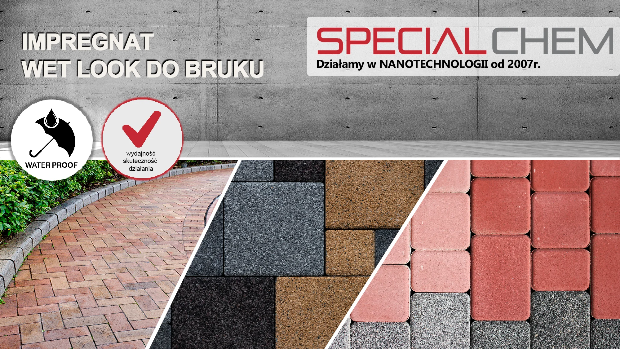 Preparat SPECIALCHEM to nowatorska powłoka przeznaczona do zabezpieczania i impregnacji betonowej kostki brukowej, krawężników i innych wyrobów betonowych, płyt chodnikowych jak również kamienia o chłonnej strukturze (piaskowiec, wapień, łupek itp.), cegły itp. Dzięki odpowiednio dobranym składnikom i nanocząsteczkom impregnat działa dwustopniowo po pierwsze wiąże się na powierzchni powodując efekt perlenia cieczy oraz ochronę przed brudzeniem po drugie wnika w głąb do kilkunastu milimetrów tworząc impregnację odporną na ścieranie.