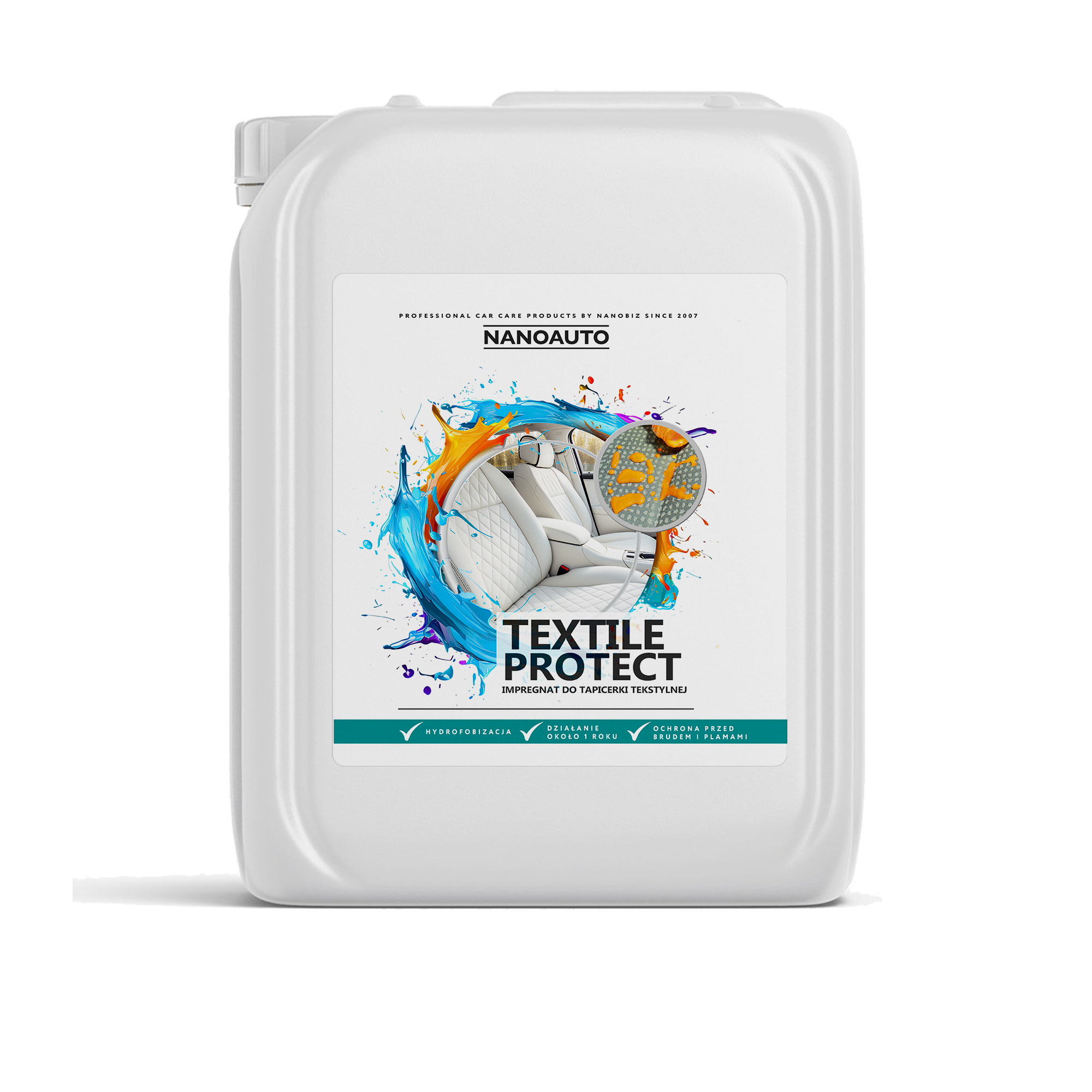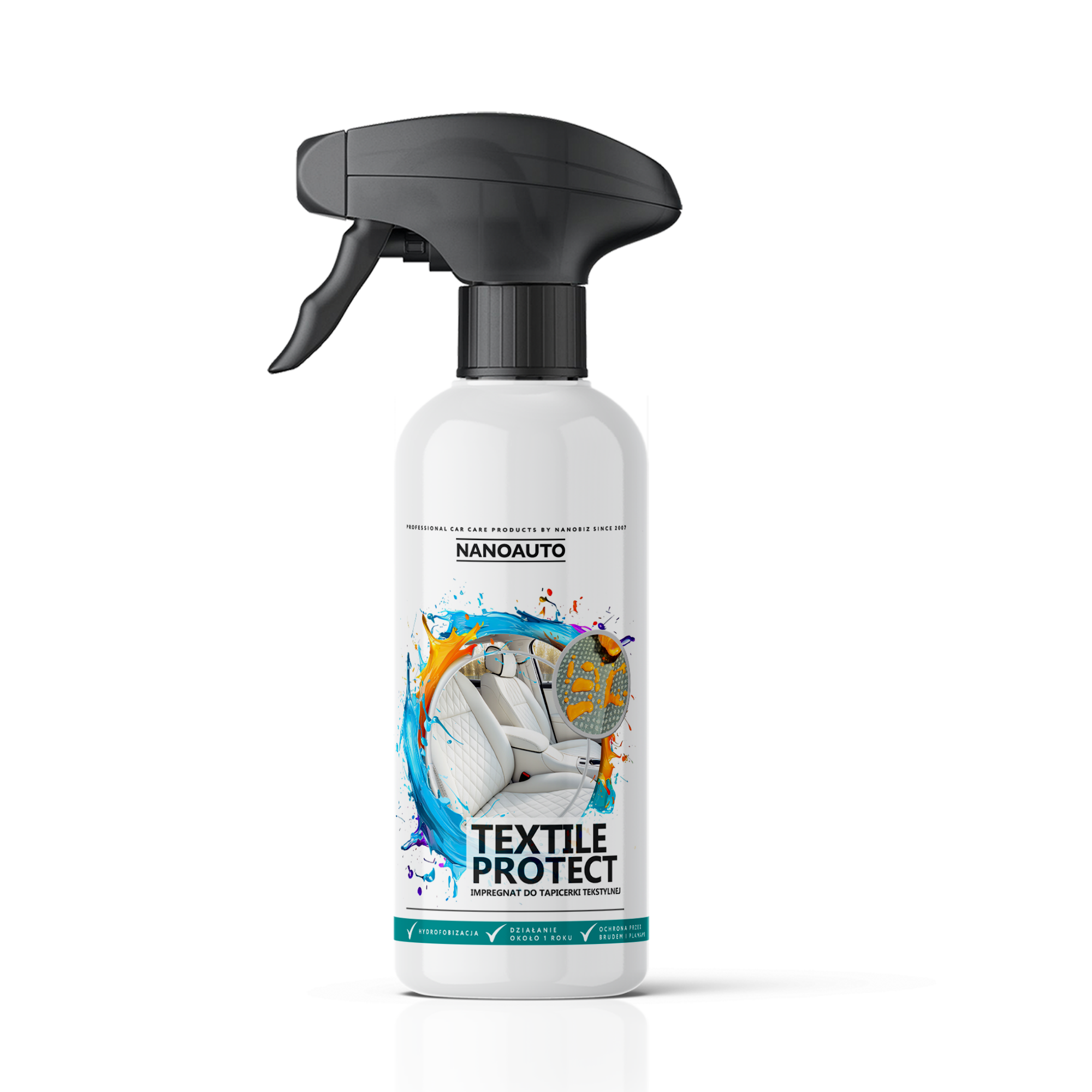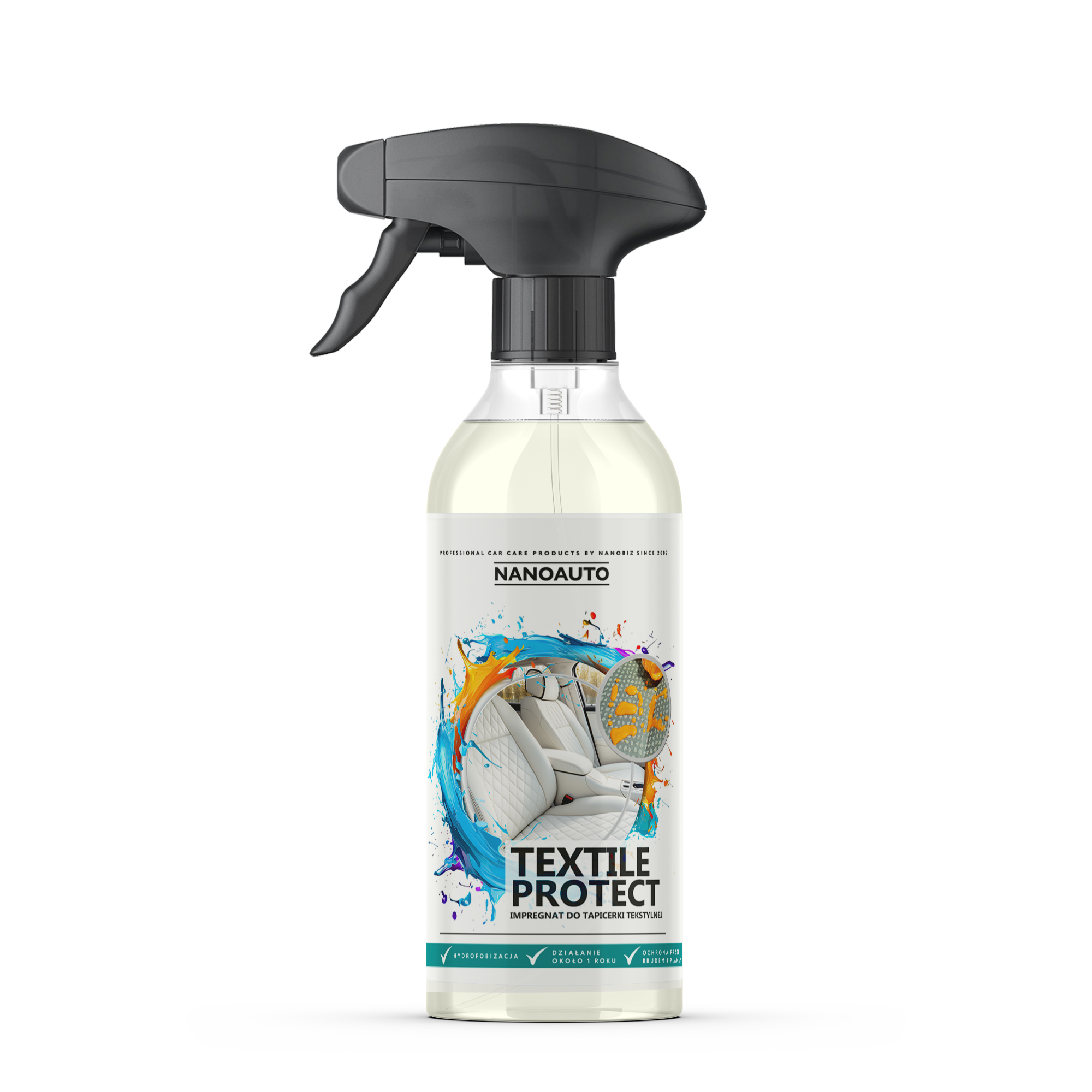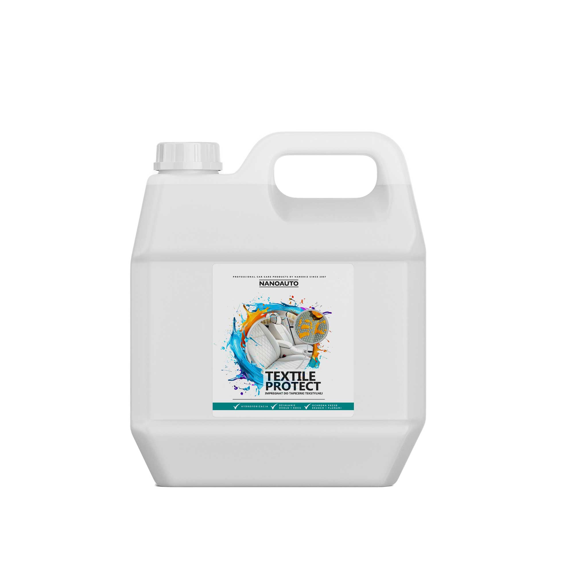 NANOAUTO Textile Protect to specjalnie opracowany impregnat, który skutecznie chroni tkaniny naturalne i syntetyczne, elementy welurowe, okładziny siedzeń i inne materiały tekstylne.