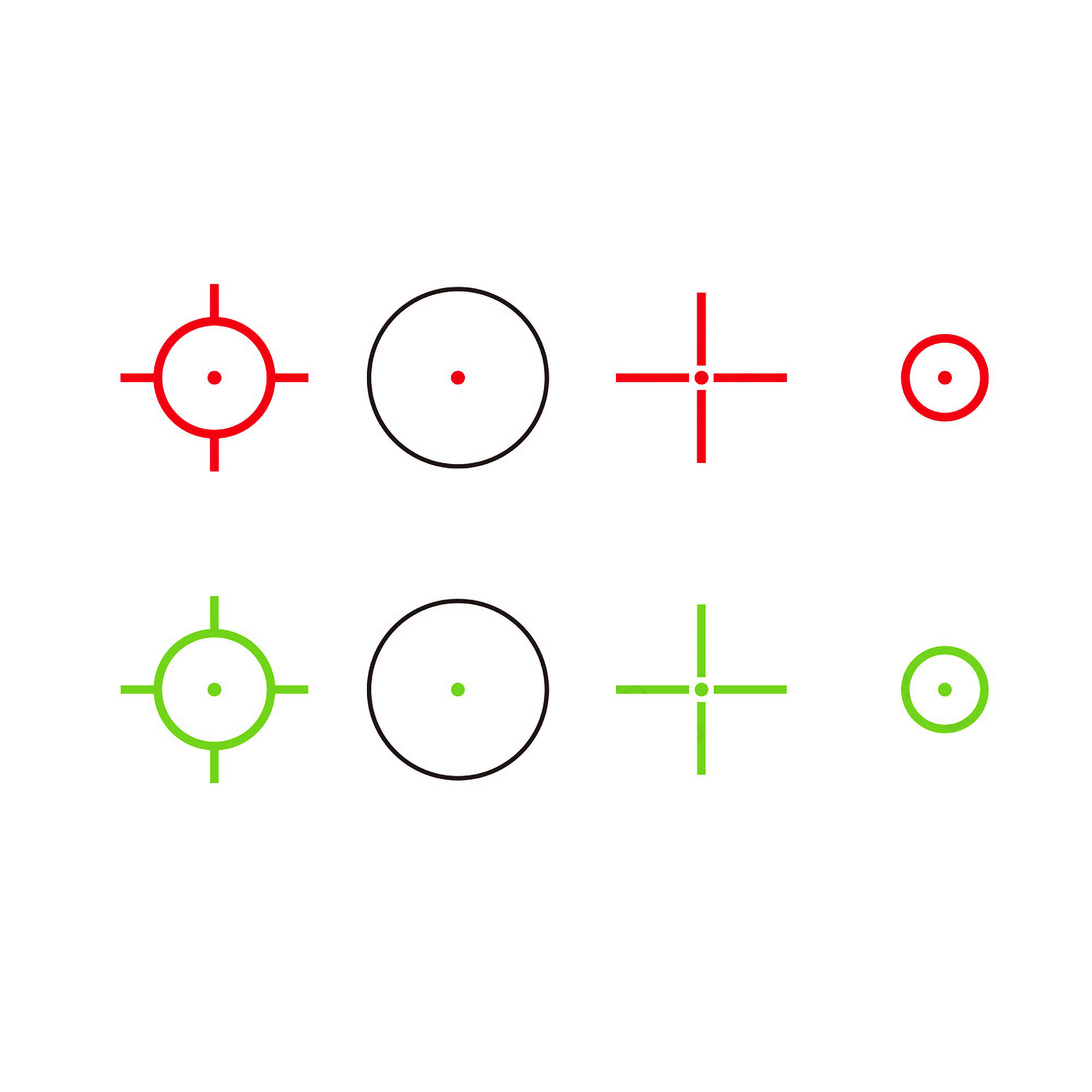 Cztery znaki celownicze 3,5 MOA: kropka, krzyż, okrąg, krzyż w okręgu.