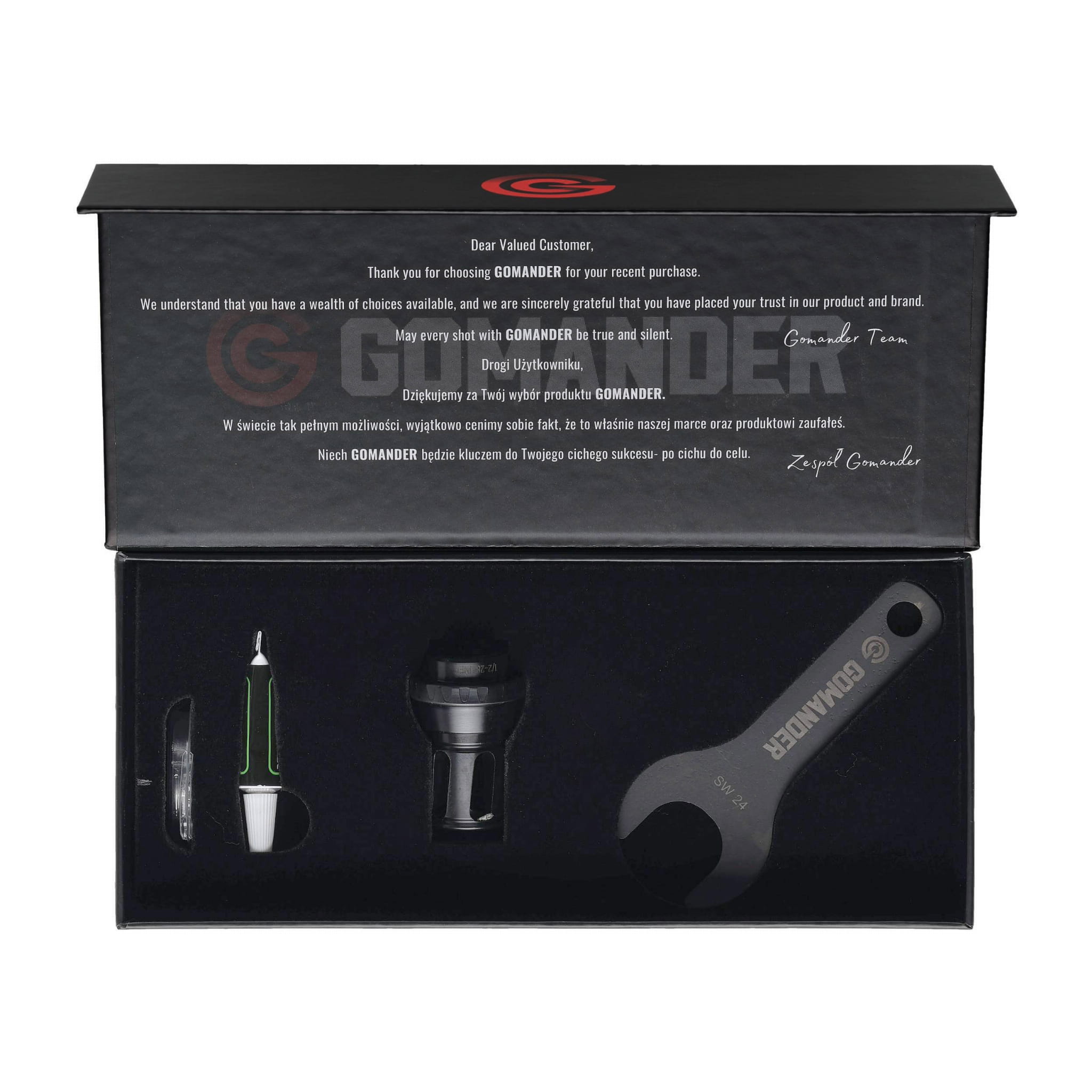 Zawartość zestawu: kompensator płomienia Gomander Helix 7,62 5/8 × 24 S, nakrętka zabezpieczająca gwint, podkładka, smar ceramiczny, kluczyk montażowy