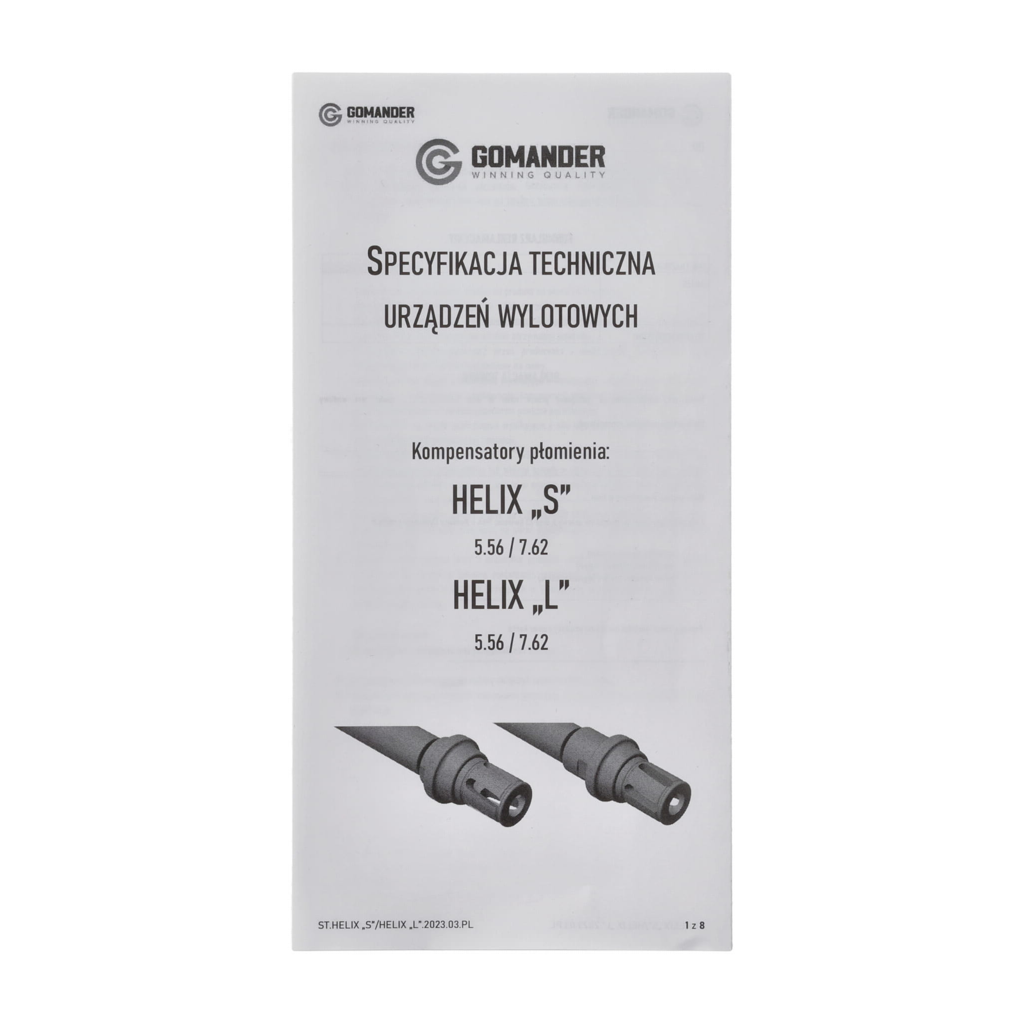 Helix 7,62 5/8 × 24 S to zaawansowany kompensator płomienia, zaprojektowany przez polską firmę Gomander. Wykonany z wysokogatunkowej stali o zwiększonej odporności na wysokie temperatury, skutecznie redukuje płomień wylotowy, zapewniając większą stabilność oraz precyzję strzałów, nawet podczas intensywnej eksploatacji.