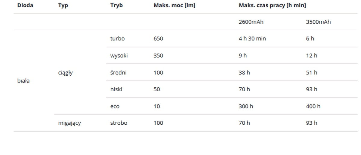 Przedstawione parametry uzyskano w warunkach laboratoryjnych. Podczas testów wykorzystywano akumulator Fenix ARB-L18-3500 18650 Li-ion 3,6 V.