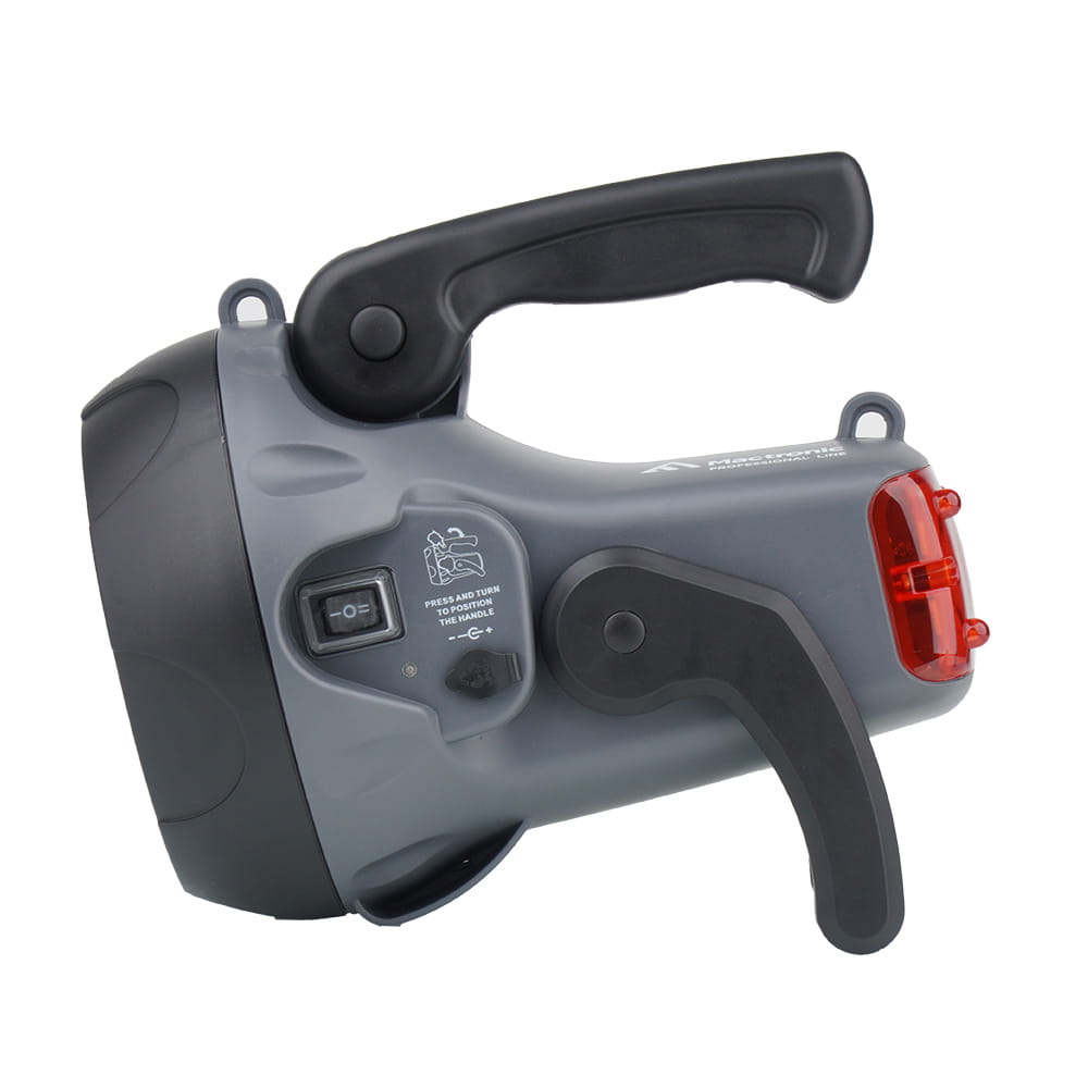 Wielofunkcyjna latarka, szperacz ze wbudowanym akumulatorem o pojemności 6600 mAh. Wyposażony w dwa tryby świecenia, mocne światło punktowe oraz czerwone światło sygnalizacyjne u mieszczone z tyłu latarki.