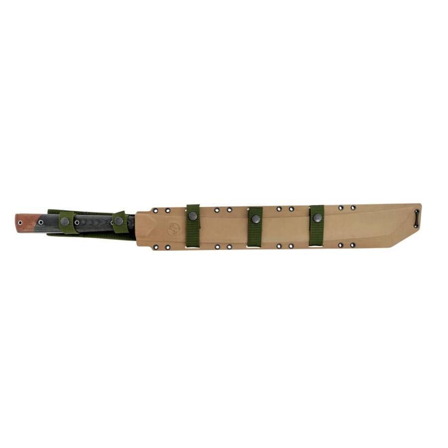 Użytkownik wraz z maczetą otrzymuje wysokiej jakości pochwę z tworzywa Kydex, która przystosowana jest do standardu mocowania MOLLE.