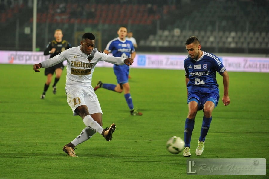 Zagłębie Sosnowiec bardzo szybko objęło prowadzenie bo już w 7 minucie meczu. Zdobywcą gola był Vamara Sanogo a asystował Tomasz Nowak. Francuz uderzył z kilkunastu metrów trafiając w pięknym stylu w światło bramki. Sosnowiczanie zafundowali swoim fanom 30 minut pięknej gry potem stracili rozmach – co sam przyznał trener Piotr Mandarysz. Niestety nie podwyższyli wyniku w czasie trwania pierwszej połowy pomimo kilku dobrych sytuacji podbramkowych.