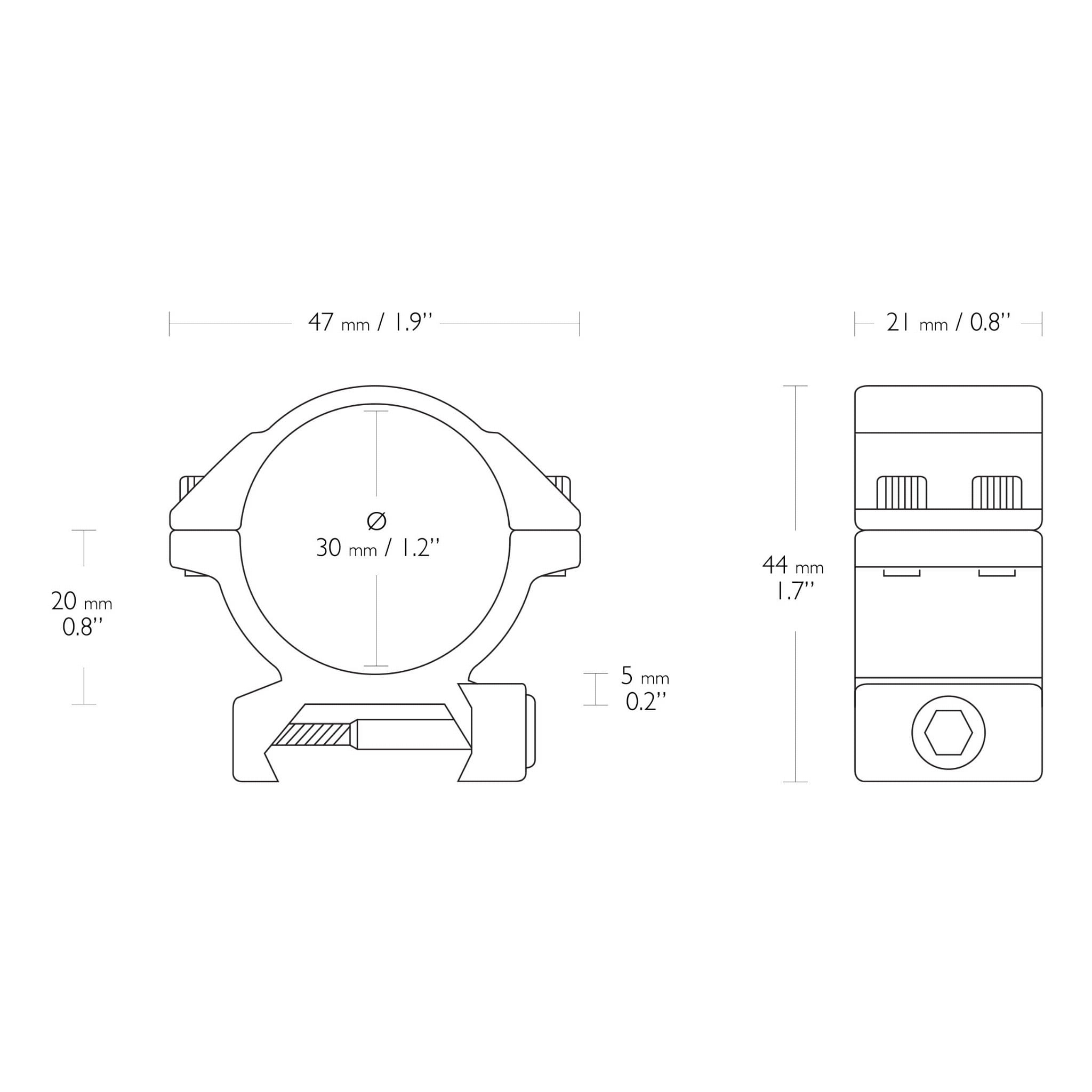 Pierścienie wykonano z anodowanego aluminium. Elementy są lekkie, dlatego nie zwiększą odczuwalnie masy karabinka. Precyzyjna konstrukcja oraz dwie śruby mocujące gwarantują pełną osiowość montażu lunety, stabilne utrzymanie zera oraz odporność na odrzut broni.