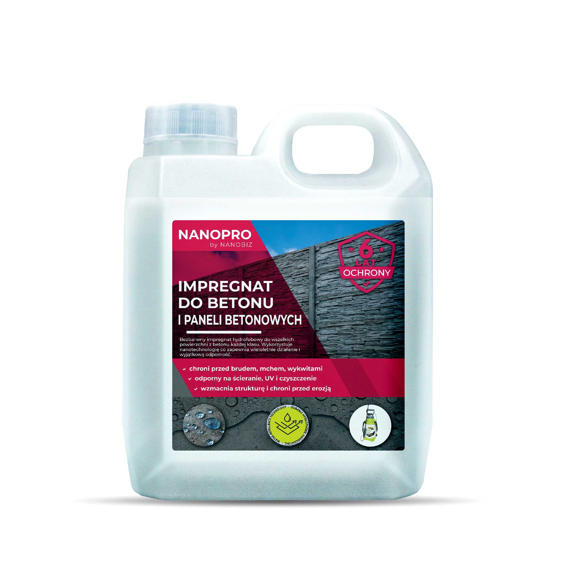 NANOPRO Impregnat do paneli i galanterii betonowej to innowacyjny, nanotechnologiczny produkt przeznaczony do bezbarwnej ochrony ogrodzeń, palisad i paneli betonowych. Preparat skutecznie impregnuje oraz silnie hydrofobizuje powierzchnie betonowe. Dzięki jego zastosowaniu, woda i inne zanieczyszczenia nie wnikają w głąb betonu. Hydrofobizacja przeciwdziała również wnikaniu transportowanych przez wodę soli, kwaśnych deszczy oraz innych substancji szkodliwych dla betonu, co może prowadzić do korozji zbrojenia, pęknięć, erozji, porostów mchów, wykwitów solnych oraz zbierania się brudu.