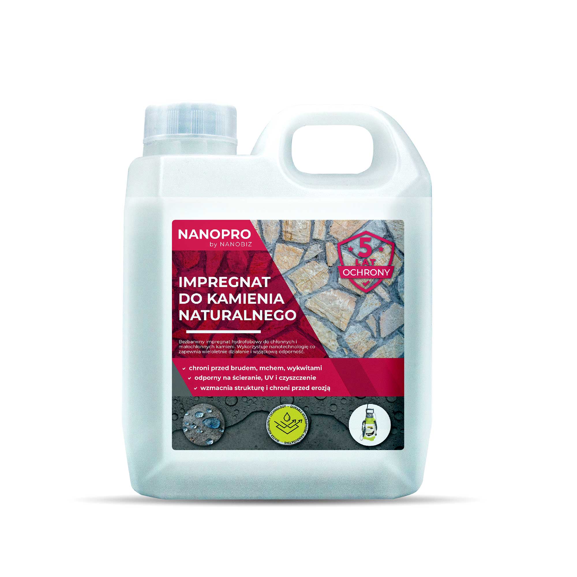 NANOPRO Impregnat do kamienia naturalnego to produkt, który znacząco wydłuża żywotność oraz utrzymuje estetyczny wygląd granitu i kamienia. Jest on przeznaczony do stosowania na różnorodnych powierzchniach, takich jak: ogrodzenia, ściany, elewacje budynków, chodniki, kładki oraz mury.