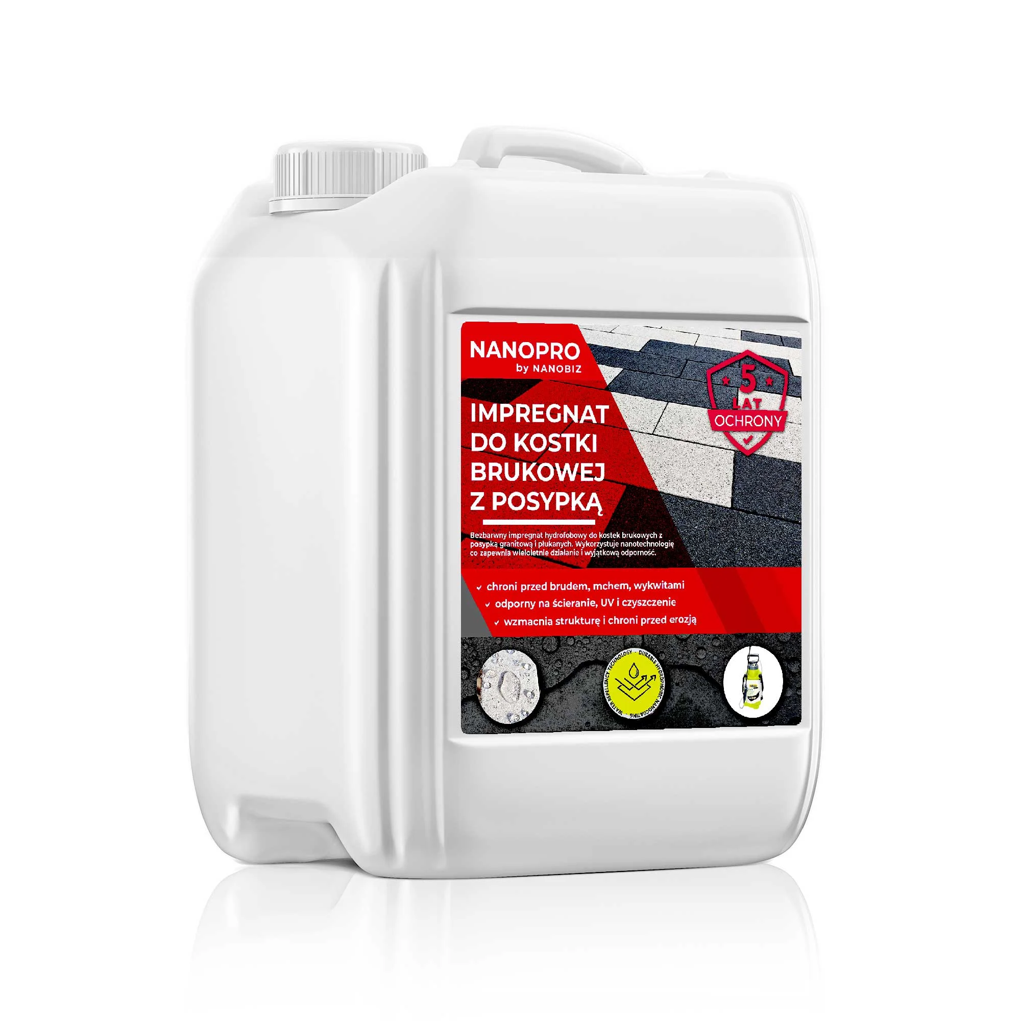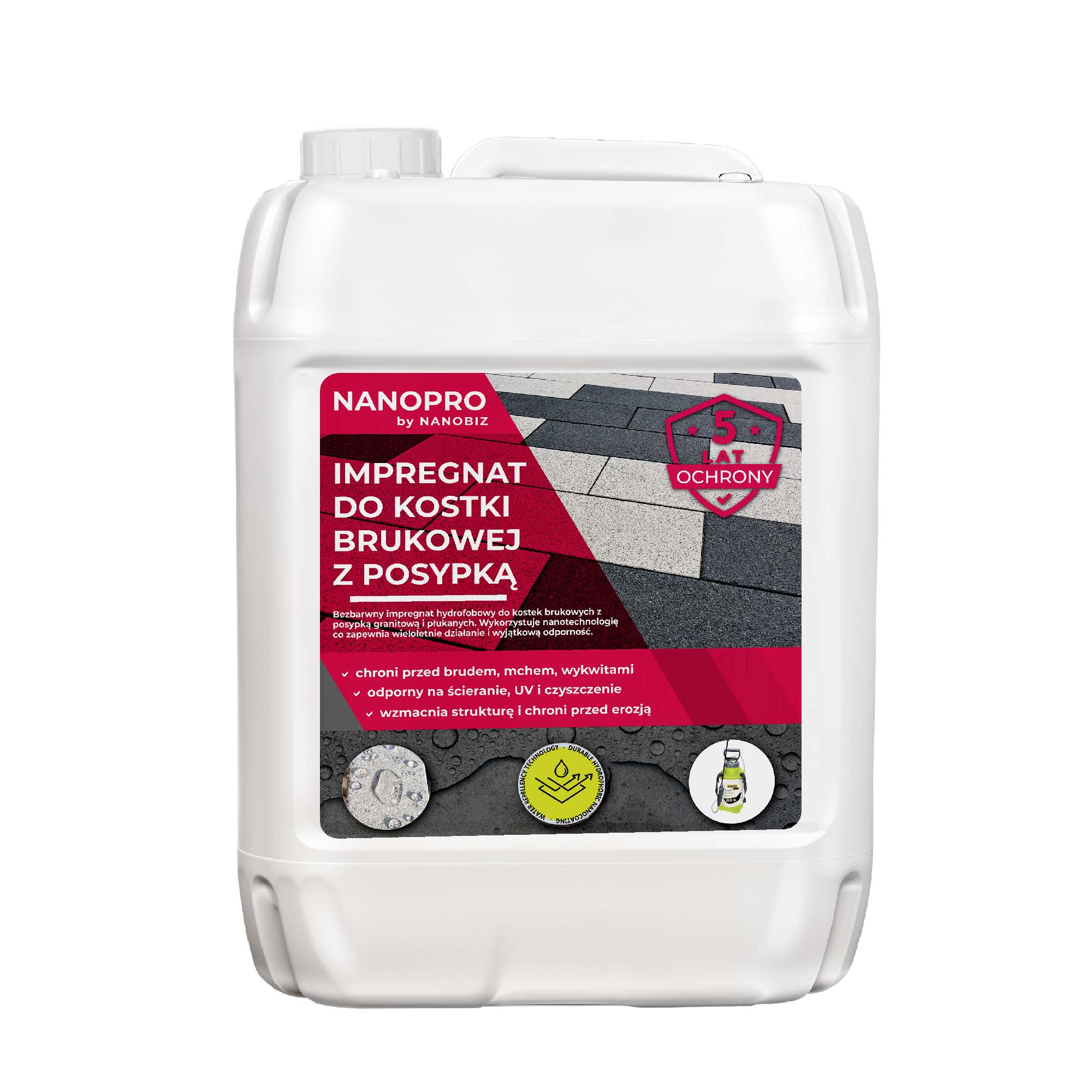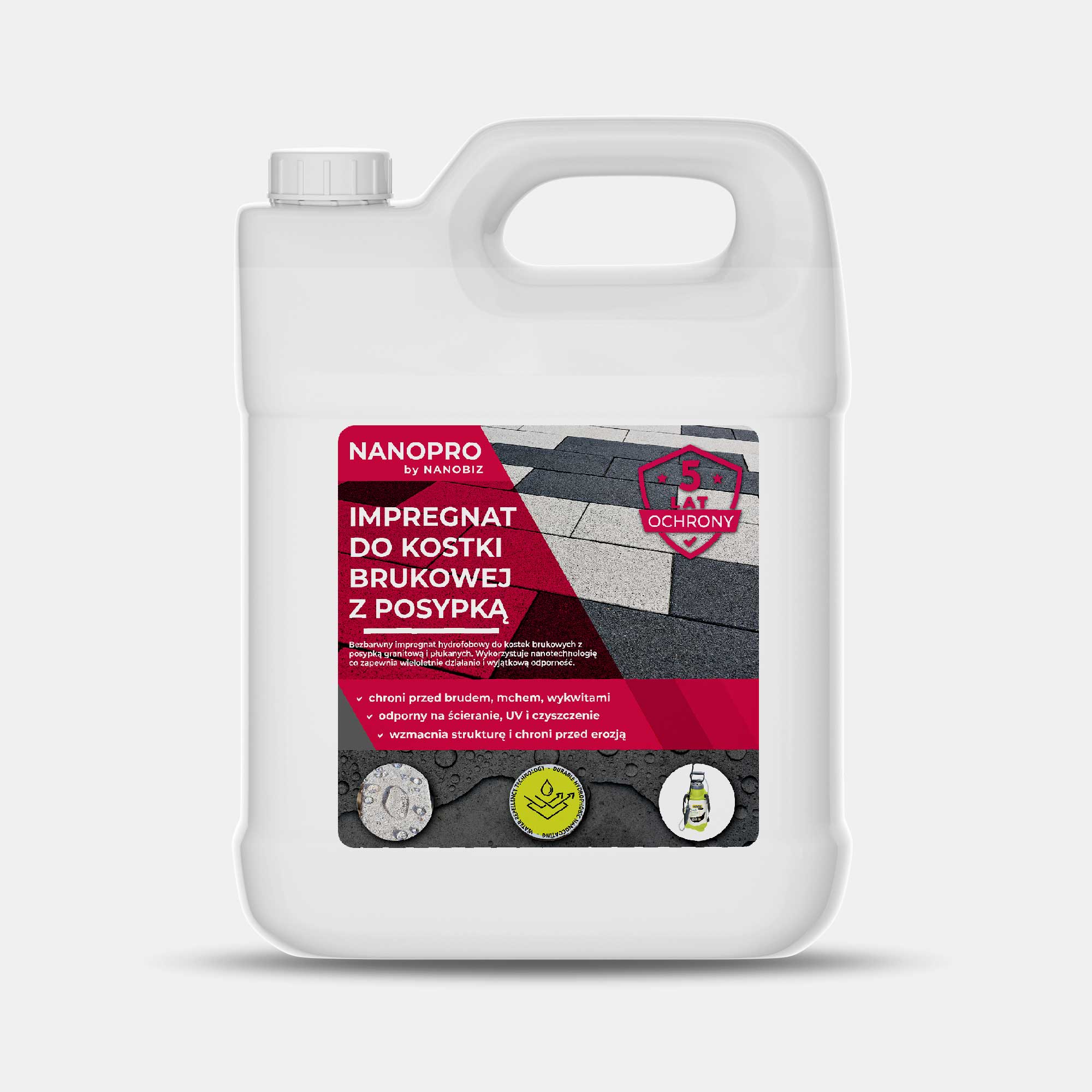 Preparat NANOPRO Impregnat do kostki brukowej płukanej wykorzystuje technologię STAY-CLEAN, która formuje niewidoczną barierę ochronną na bruku, znacząco ułatwiając utrzymanie czystości i blokując wnikanie zanieczyszczeń. Dodatkowo podnosi wytrzymałość na ścieranie, co przekłada się na dłuższą żywotność i niezmienioną estetykę nawierzchni nawet przy intensywnej eksploatacji. Efektywne zabezpieczenie przed kolonizacją przez mikroorganizmy, mchy i glony sprawia, że brukowane powierzchnie pozostają nieskazitelne i wizualnie atrakcyjne.