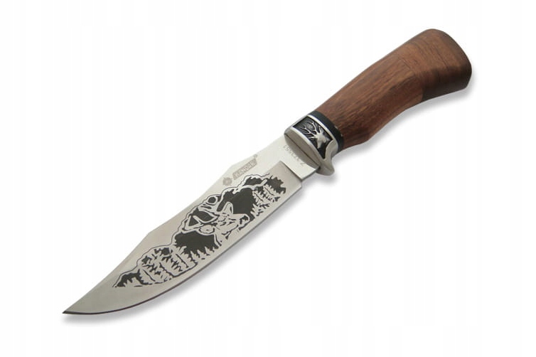 Dodatkowym walorem starannie wyprofilowanej głowni ze stali 440 jest fałszywe ostrze znacznie poprawiające walory penetracyjne noża. Oba płazy głowni ozdobione są wizerunkiem głowy jelenia z okazałym porożem wśród drzew. Doskonale dopasowana do dłoni rękojeść z naturalnego drewna, przytwierdzona jest do trzpienia dwoma solidnymi nitami. To nóż piękny i niezawodny. W komplecie nylonowa pochwa zapinana na dwa rzepy.