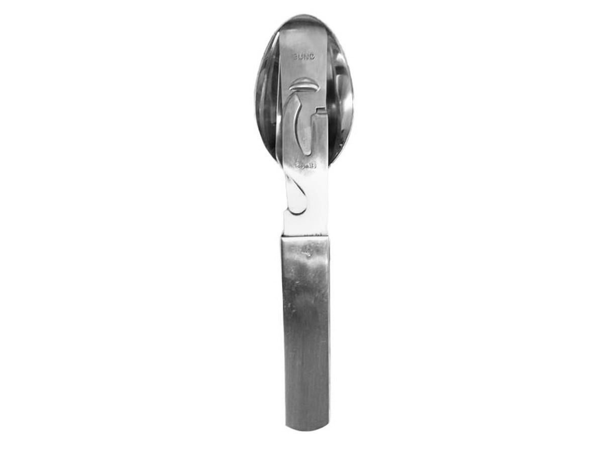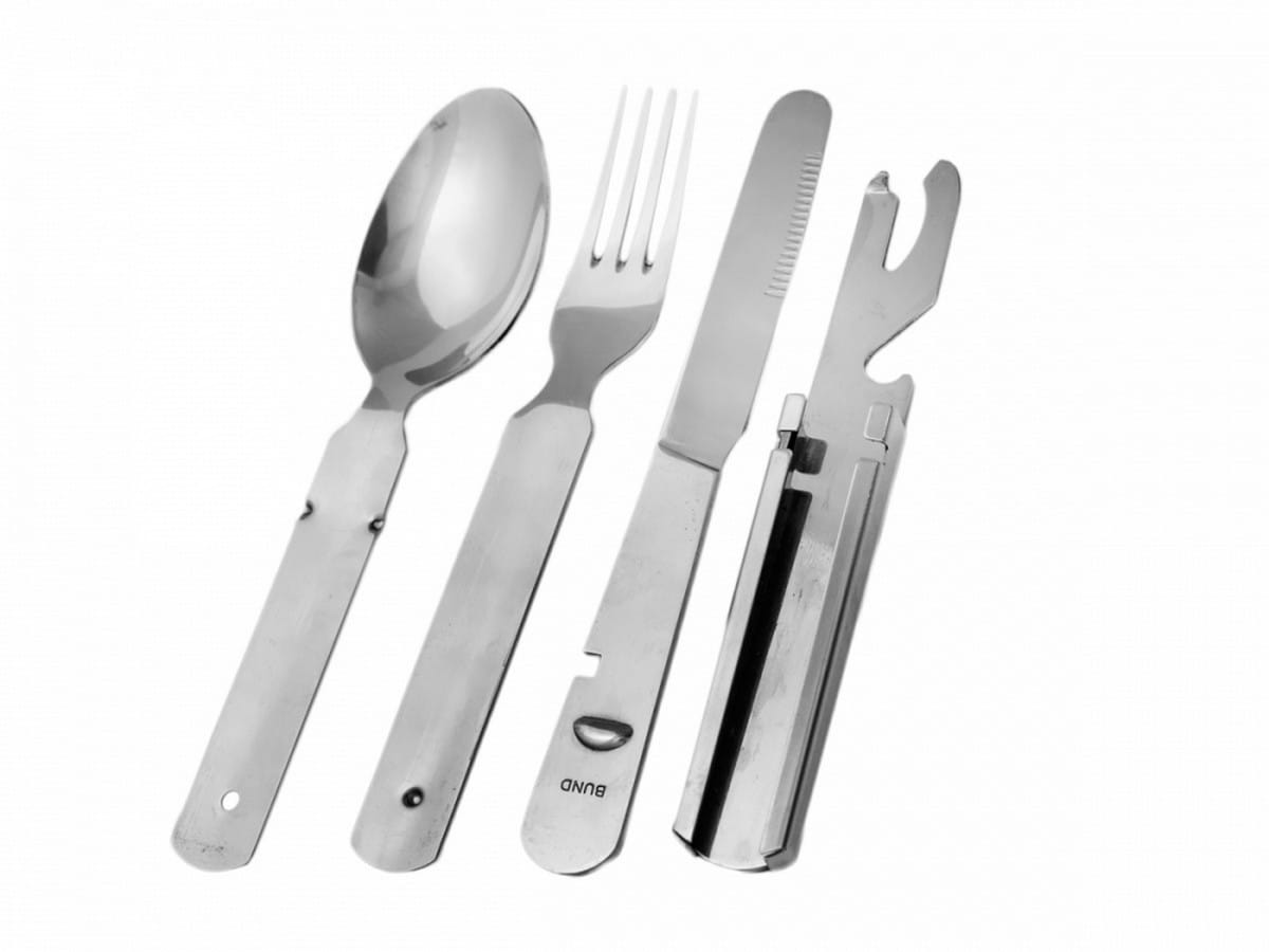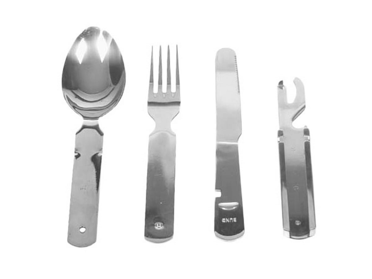 Niezbędnik MFH 4-częściowy został doskonale wykonany z mocnej i grubej stali nierdzewnej dla niemieckiej marki FOX. W zestawie znajduje się: nóż o strukturze piły, widelec, łyżka oraz otwieracz do puszek i butelek o standardowych wymiarach tych narzędzi, zaprojektowany na wzór niezbędników Bundeswehry. Wszystkie elementy można złożyć w taki sposób,  jak to zostało uwidocznione na zdjęciu.