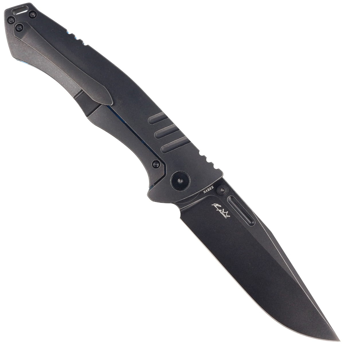 Głownia - szeroka, typu Clip Point z praktycznym, maskującym rysy wykończeniem Black Stonewashed. Wydatny brzusiec wydłuża długość krawędzi tnącej w stosunku do długości klingi zbiegając się w kierunku ostrego jak igła czubka noża. Grubość klingi zapewnia wysoką wytrzymałość podczas gdy wysoki, płaski szlif daje doskonałą geometrię krawędzi tnącej oraz ekstremalną wydajność cięcia. Ceramiczne łożyska kulkowe wspomagają otwarcie ostrza za pomocą szybkiej płetwy flippera (index-finger flipper) po otwarciu pełniącej funkcję jelca. Nóź możemy również otworzyć przy użyciu obustronnego kołka w klindze (double thumb stud). Całość blokowana jest sprawdzoną i popularną blokadą frame lock ze stalową wkładką zabezpieczającą przed wycieraniem czoła blokady.