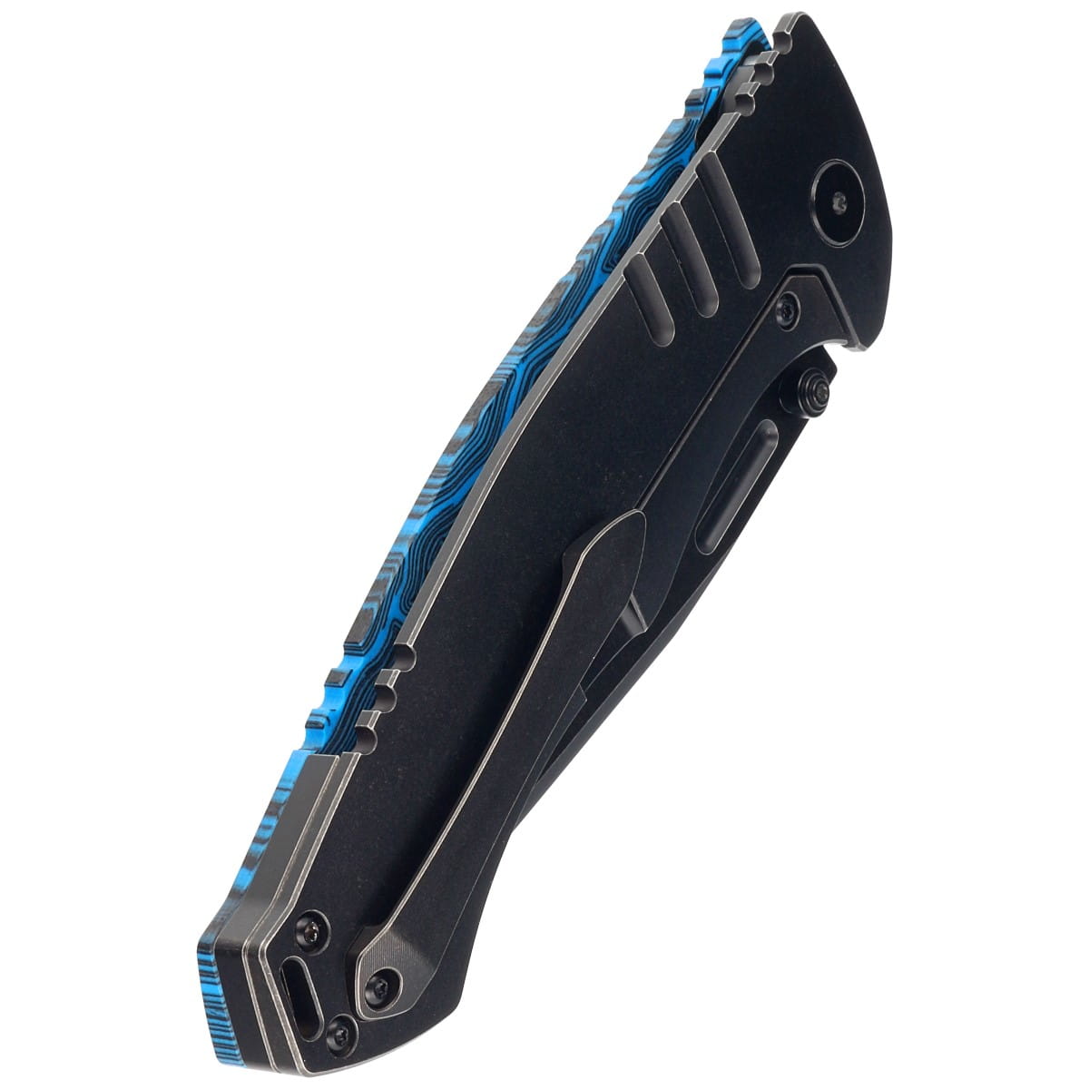 Rękojeść - strona reprezentacyjna wykonana z Damascus G10 o niepowtarzalnym wzorze, strona blokady z litego tytanu 6AL4V. Fazowane krawędzie okładek eliminują ostre ranty dla wygody i poprawiają pewność uchwytu. Masywny tytanowy backspacer do którego przymocowano okładziny gwarantuje sztywność i wytrzymałość całej konstrukcji. Fragment grzbietu rękojeści pokryto upper jimping, karbowanym oparciem pod kciuk ułatwiającym kontrolę nad nożem. Jednopozycyjny, prawostronny tytanowy klips umożliwia przenoszenie noża w pozycji tip-up, czubkiem ostrza ku górze.