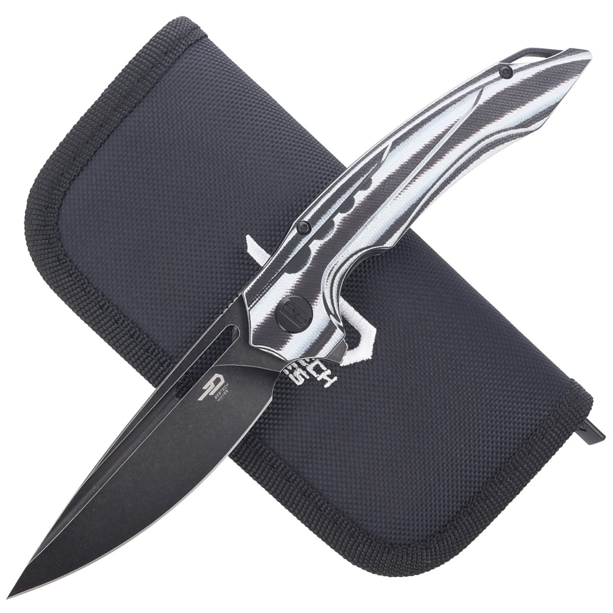 Rękojeść - mocno zakrzywiona, dwukolorowa rękojeść z białego kompozytu G10 (włókno szklane prasowane pod ciśnieniem z żywicą syntetyczną) i z czarnego włókna węglowego zapewnia doskonały uchwyt w wielu pozycjach. Fazowane krawędzie okładek eliminują ostre krawędzie. Przykręcane do solidnego, stalowego backspacera, w jego górnej części otwór na linkę zabezpieczającą lub ozdobną. Oś pivota zdobi stylizowana litera "B". Tytanowy, jednopozycyjny, prawostronny klips deep carry pozwala przenosić dyskretnie nóż w kieszeni w pozycji tip-up (czubkiem ostrza do góry). Podcięcie na palec (fore finger groove) poprawia pewność uchwytu.