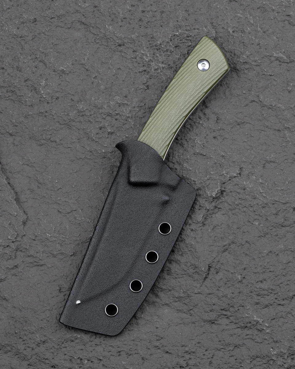 Rękojeść - z kompozytu G10 charakteryzuje się odpornością na uderzenia, wilgoć i zmienne warunki atmosferyczne. Jej tekstura i symetryczne podcięcia wzmacniają pewność chwytu, niezależnie od sytuacji. Konstrukcja full tang zapewnia integralność strukturalną i zwiększa stabilność podczas intensywnego użytkowania. Pochwa z kydexu, kompatybilna z wieloma systemami montażu, umożliwia wygodne i dyskretne przenoszenie noża – zarówno na pasie, jak i na oporządzeniu. To doskonale wyważone narzędzie do codziennego użytku i taktycznych zastosowań terenowych.