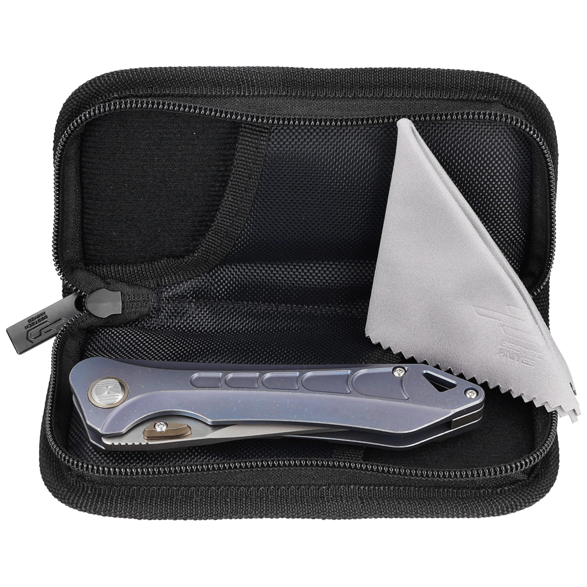 Futerał - nóż zapakowano w zapinany zamkiem nylonowy miękki pouch z logo marki służący do bezpiecznego przenoszenia i przechowywania foldera.