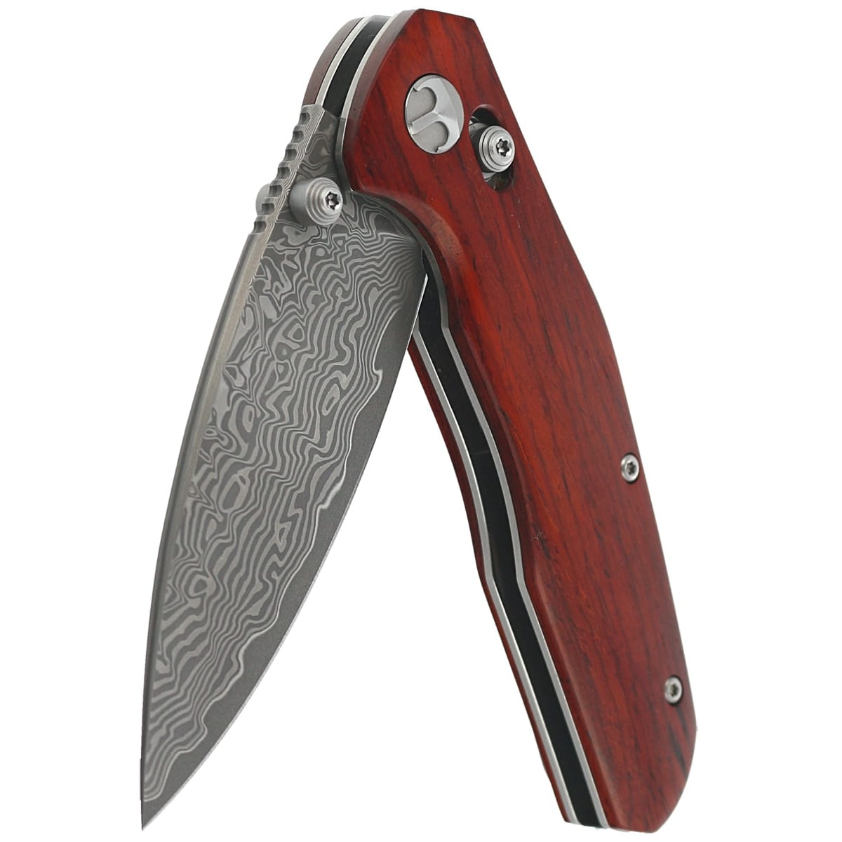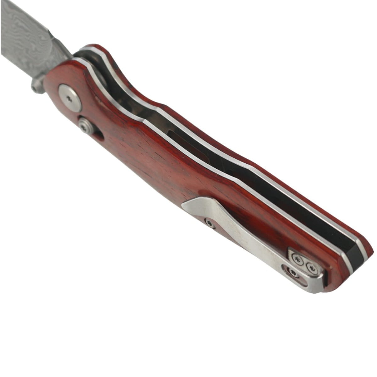 Rękojeść - okładziny z drewna Rosewood o niepowtarzalnym splocie słojów, przykręcono do stalowej ramy noża. Masywny backspacer do którego przymocowano okładziny gwarantuje sztywność i wytrzymałość całej konstrukcji. Prosta, solidna konstrukcja daje pewność wieloletniego użytkowania. Pivot ozdobiony stylizowanym logo producenta. Jednopozycyjny (prawa) stalowy klips deep carry pozwala przenosić dyskretnie nóż w kieszeni w pozycji tip-up (czubkiem ostrza do góry).