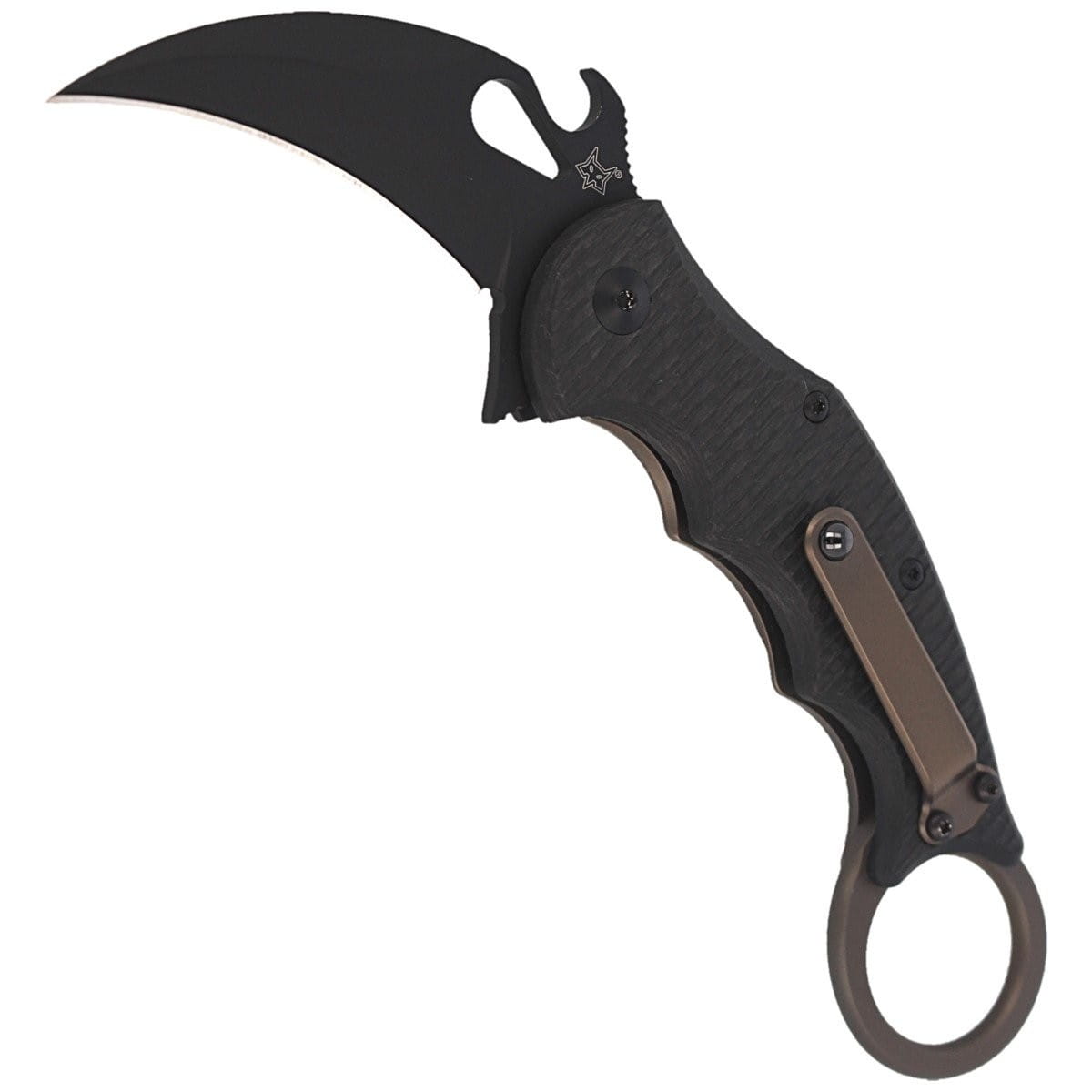 Karambit Titanium Frame Lock, luksusowy składany karambit włoskiej firmy FOX. Połączenie najlepszych materiałów tytanu, włókna węglowego oraz ostrza z wysokowydajnej stali Elmax pokrytego powłoką Cerakote™ black. Trzy systemy szybkiego otwarcia noża Emerson Wave Opening, flipper oraz podłużne wycięcie w klindze.