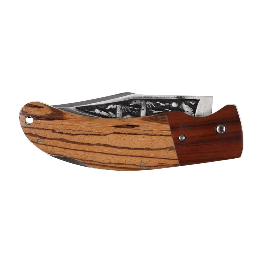 Elegancki Design: Piękna drewniana rękojeść i ozdobny grawerunek na ostrzu czynią ten nóż wyjątkowym narzędziem