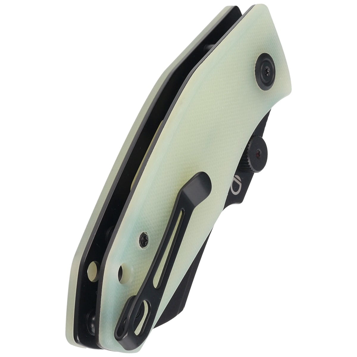 Dane techniczne: Numer produktu: KU337C Nazwa produktu: Monsterdog Jade G10, Darkwashed Długość całkowita: 178.0 mm / 7.01" Długość głowni: 75.0 mm / 2.95" Grubość głowni: 4.0 mm / 0.16" Długość rękojeści: 103.0 mm / 4.06" Grubość rękojeści: 14.0 mm / 0.55" Waga: 140.0 g / 4.84 oz Materiał głowni: Sandvik 14C28N Twardość głowni: 58-60 HRC Szlif głowni: Flat Wykończenie głowni: Darkwashed Materiał rękojeści: G10 Kolor wykończenie rękojeści: Jade Materiał backspacera: Stainless Steel Kolor backspacera: Black Klips: Right / Left, Tip-Up Materiał klipsa: Stainless Steel Mechanizm pivota: Caged Ceramic Ball Bearing (Ceramiczne łożyska kulkowe) Blokada: Liner Lock Sposób otwierania: Manual, dual thumb stud Dodatkowe akcesoria: Brak Designer: Dmitry Osarenko Marka: Kubey Knife Producent: Kubey Knife Kraj pochodzenia: P.R.C.