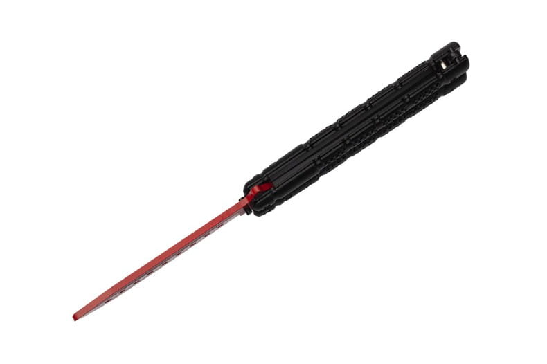 Nóż posiada tępe ostrze wykonane ze stali nierdzewnej 420 wyposażone w otwory redukujące wagę.
