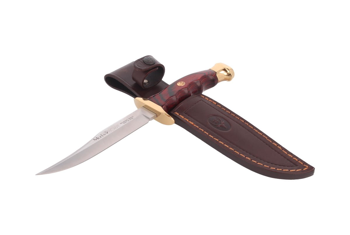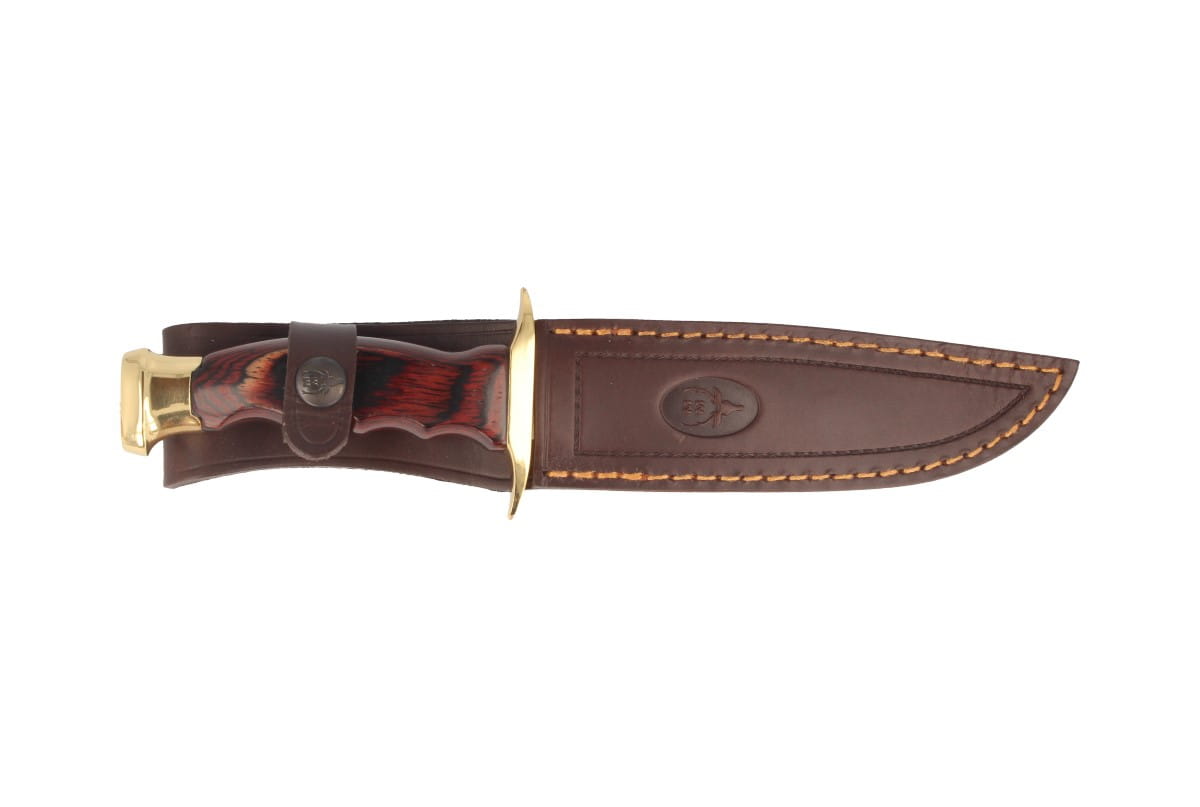 Rękojeść z laminatu drewna pakka, z mosiężnymi elementami, jest ergonomicznie profilowana dla wygodnego chwytu. Pochwa z naturalnej skóry, ręcznie szyta i wyposażona w tłoczone logo, umożliwia noszenie noża na pasie w pozycji pionowej. Idealny dla myśliwych, kolekcjonerów i miłośników aktywności na świeżym powietrzu.