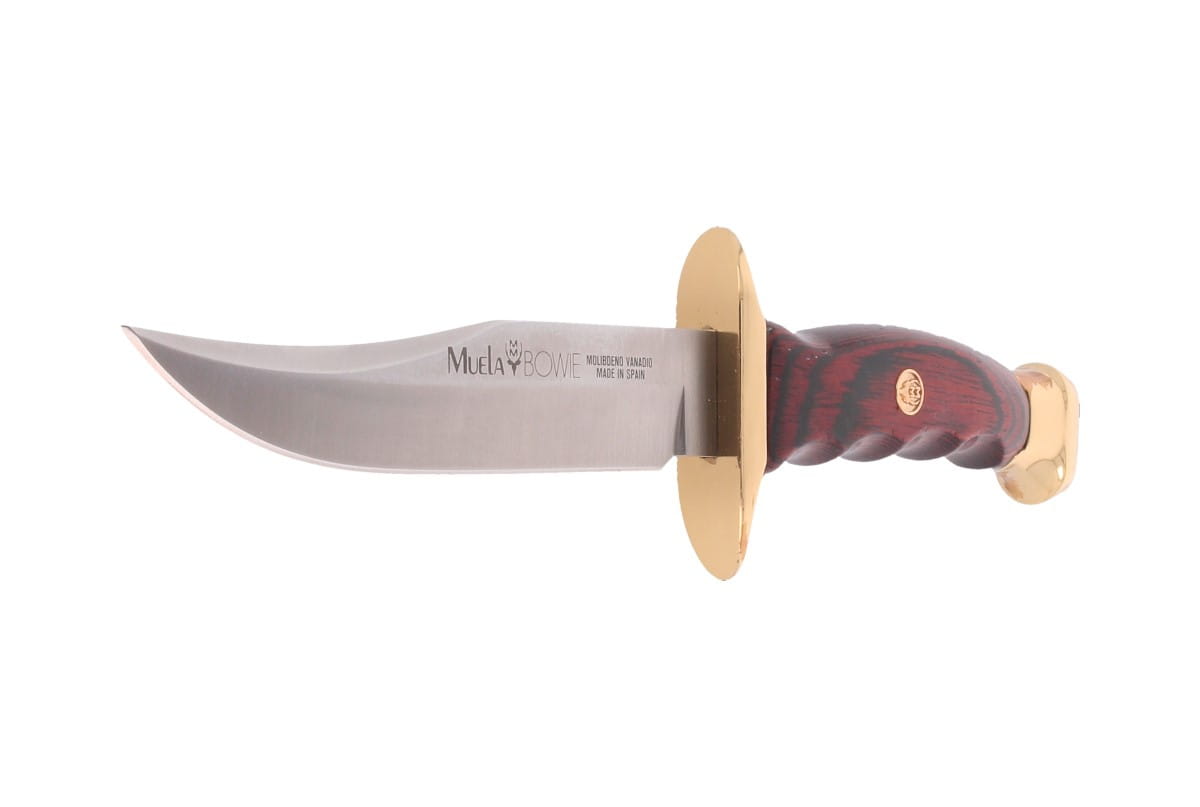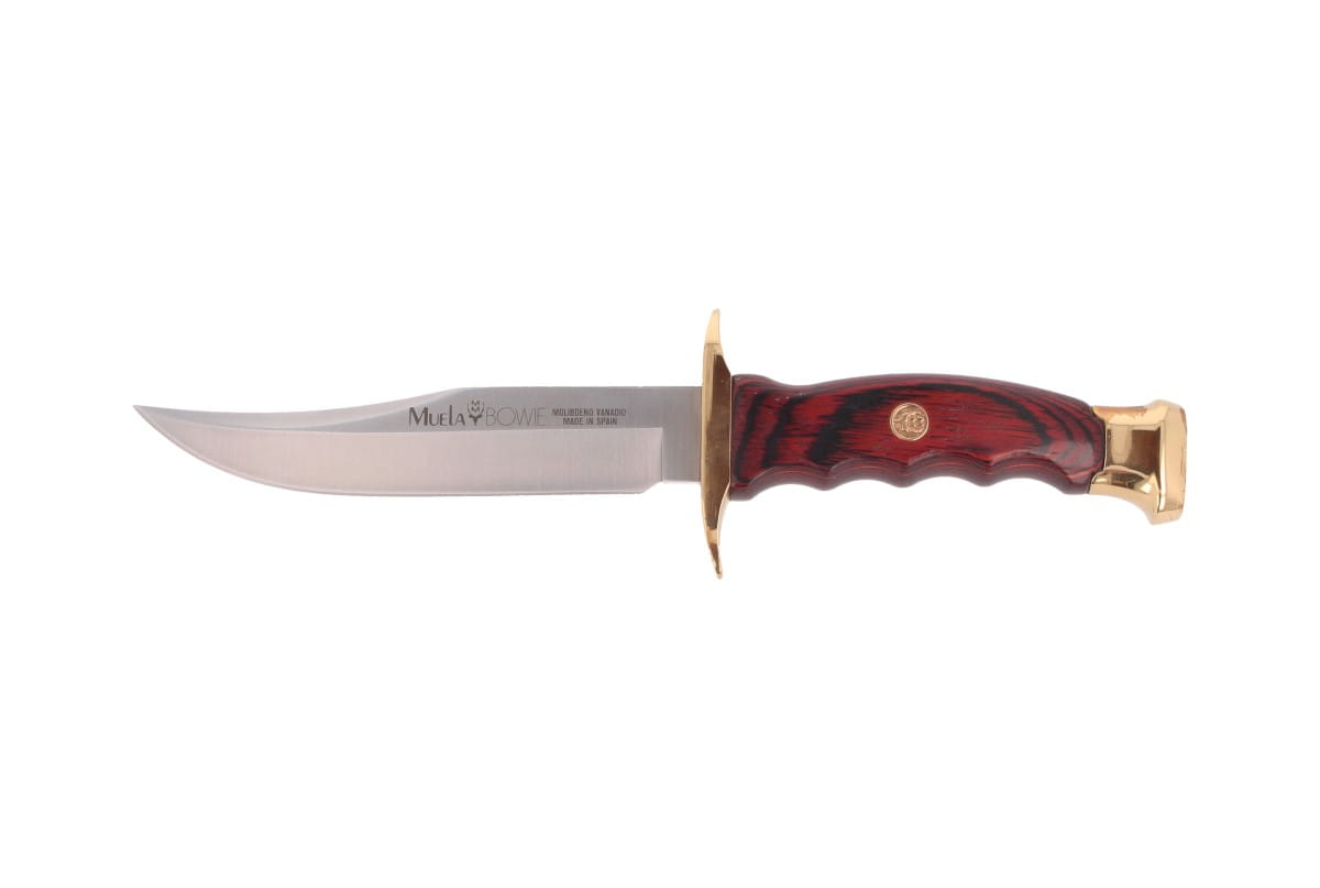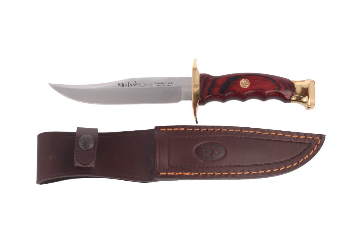 Nóż Muela BW-16 to wytrzymały nóż ze stałą klingą (4.5 mm grubości), zaprojektowany dla myśliwych i miłośników survivalu. Głownia o klasycznym profilu Bowie wykonana jest ze stali nierdzewnej MoVa (X50CrMoV15), utwardzanej do 57-58 HRC, co zapewnia doskonałą trwałość. Posiada mosiężny jelec chroniący dłoń oraz profilowane okładziny z laminowanego drewna pakka. Klinga pokryta jest pół-matową powłoką Satin Finish. Nóż jest dostarczany z eleganckim, brązowym etui ze skóry, umożliwiającym pionowe mocowanie do pasa