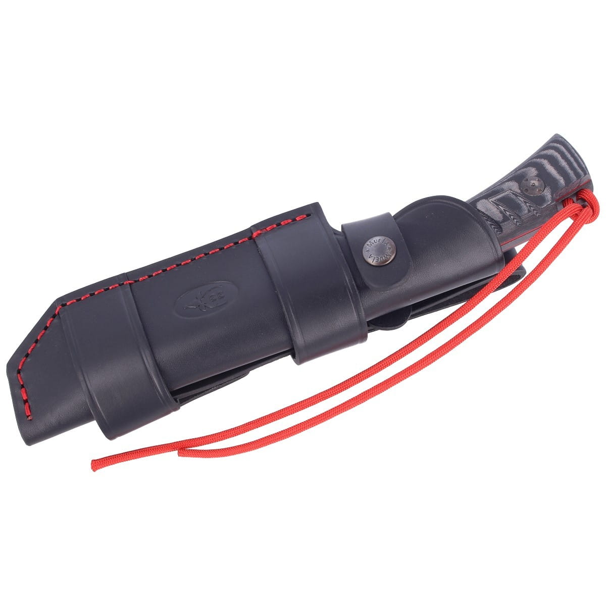 Ręcznie szyta, wykonana z naturalnej skóry w kolorze czarnym z tłoczonym logo producenta. Mocowanie do pasa lub oporządzenia umożliwia przenoszenie noża w pozycji pionowej lub poziomej.