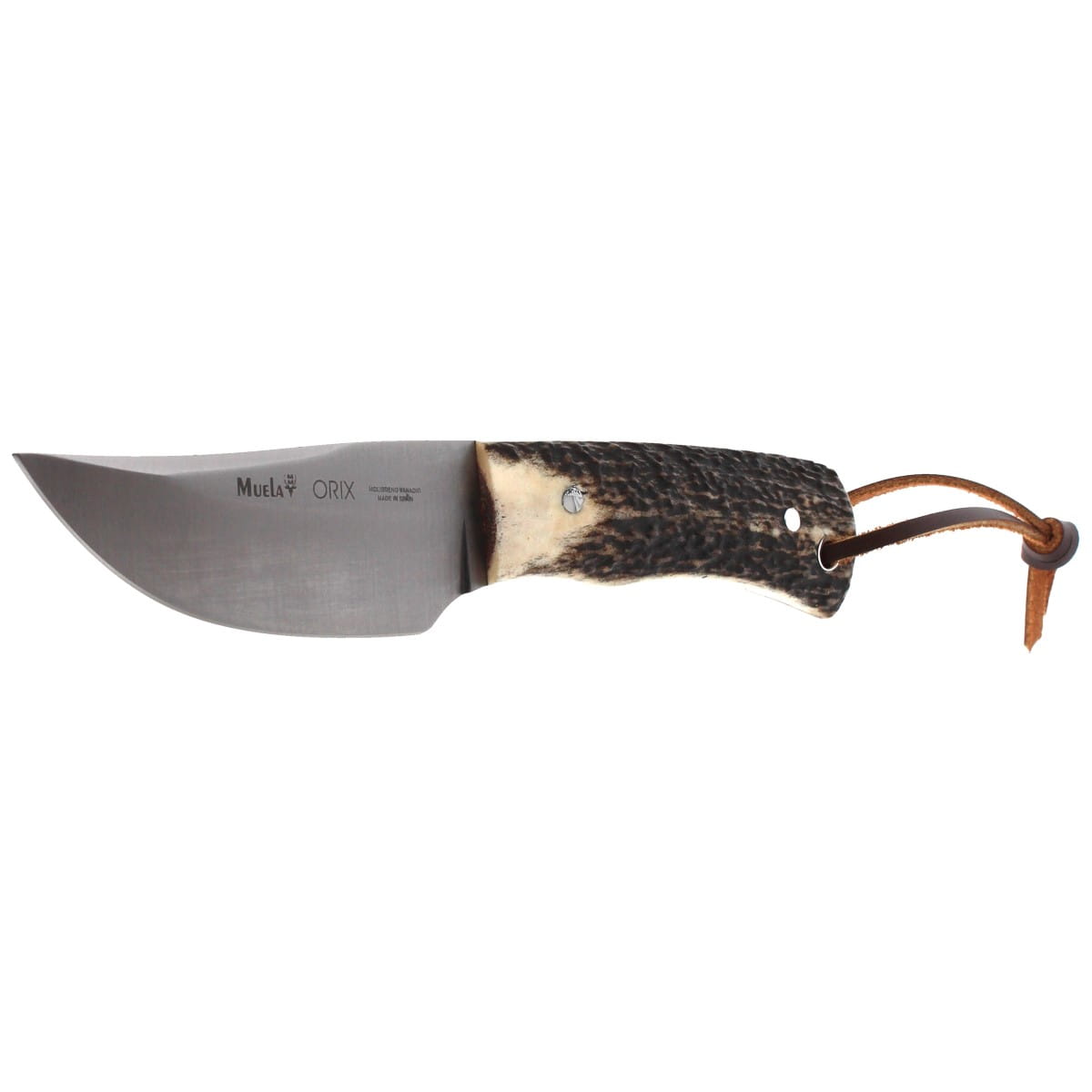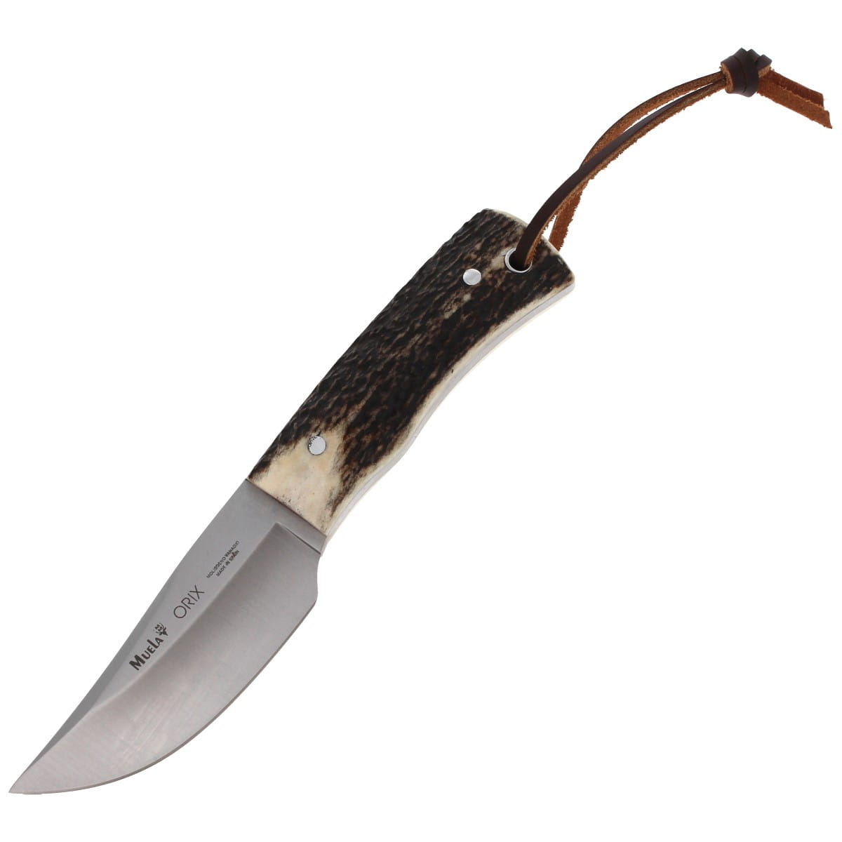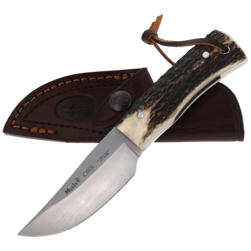 Dane techniczne: Numer produktu: ORIX-8A Rodzaj stali: X50CrMoV15 Długość głowni: 80 mm / 3.15" Grubość głowni: 3.6 mm / 0.14" Długość całkowita: 170 mm / 6.69" Waga: 127 g / 4.48 oz Rodzaj krawędzi tnącej: Plain Typ głowni: Clip Point Rodzaj szlifu: Wklęsły Materiał rękojeści: Poroże jelenia Pochwa: Skórzana Producent: Muela, Hiszpania