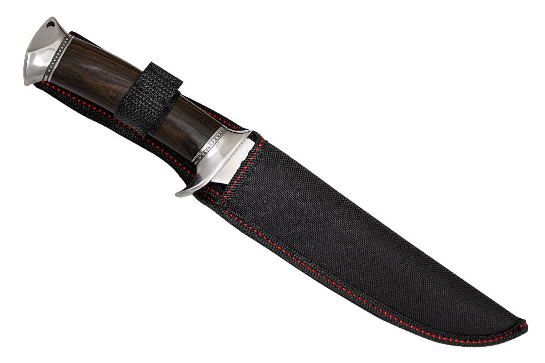 Tradycyjny nóż myśliwski posiadaczarną kaburę z cordury, którą można przymocować do paska spodni.