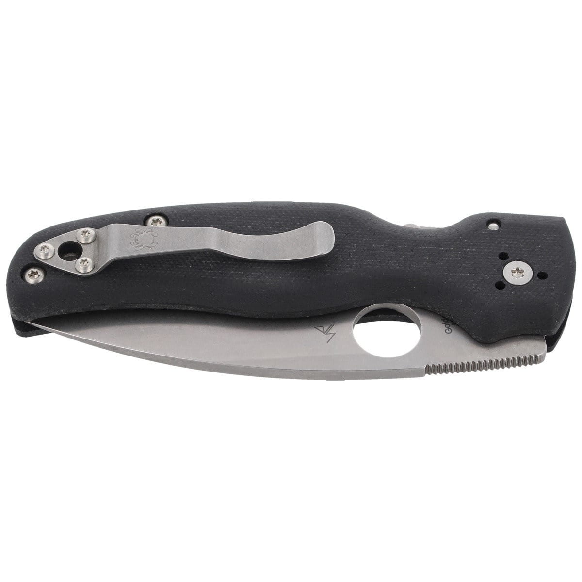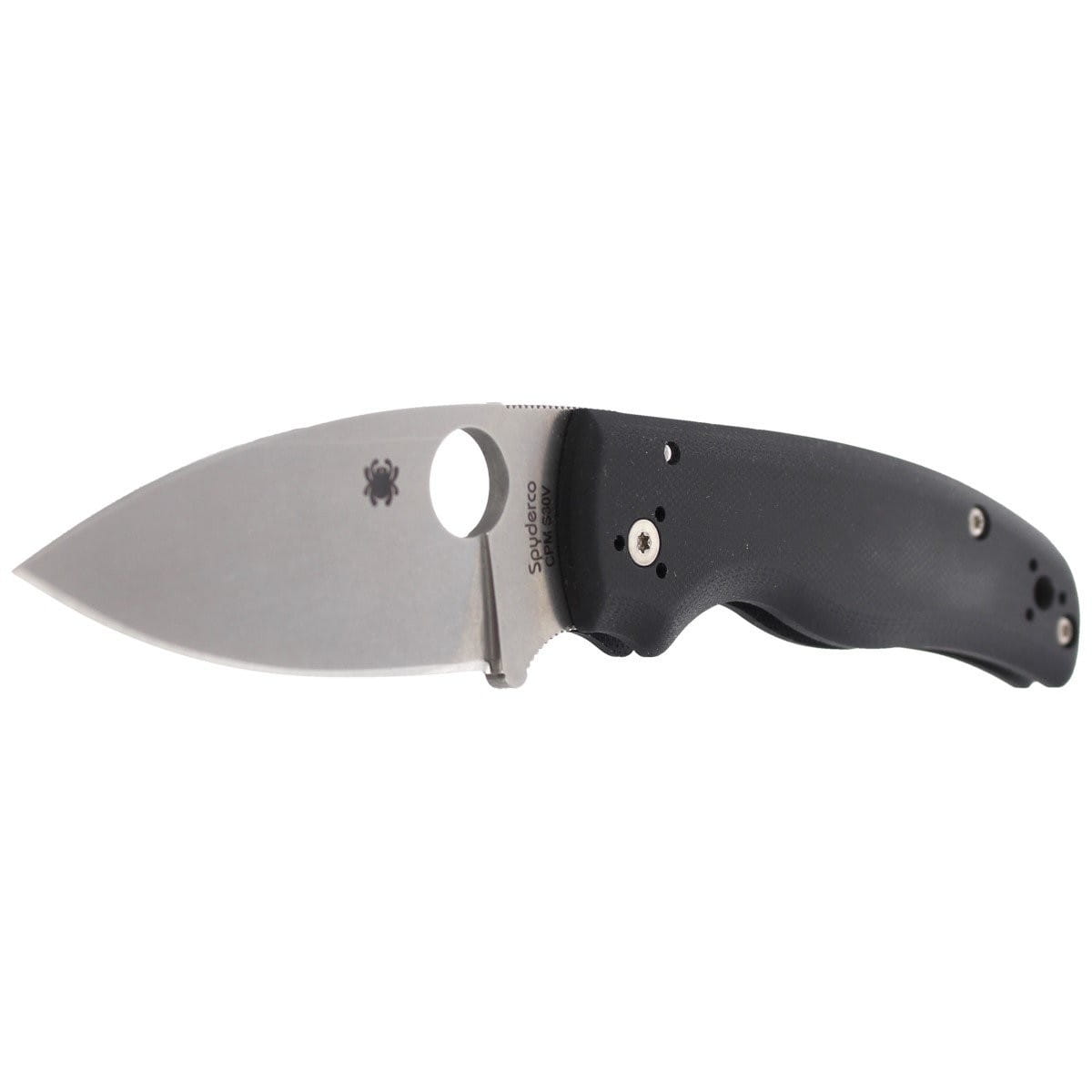 Głownia - o profilu Drop Point, grubości 3.7 mm. Ostrze gładkie Plain wyprowadzono szlifem płaskim pełnym (Full Flat Grind). Płaski szlif zapewnia doskonałą geometrię krawędzi tnącej z ostrym czubkiem. Głownię pokryto nierefleksyjną matową powłoką Stone Washed (maskującą drobne rysy powstałe podczas eksploatacji). Powiększone 14 mm okrągłe wycięcie SpyderHole (patent Spyderco) umożliwia szybkie otwarcie noża. Długa karbowana rampa pod kciuk oraz Finger Choil (profilowane podcięcie pod palec wskazujący między rękojeścią a krawędzią tnącą) ułatwiają panowanie nad nożem.