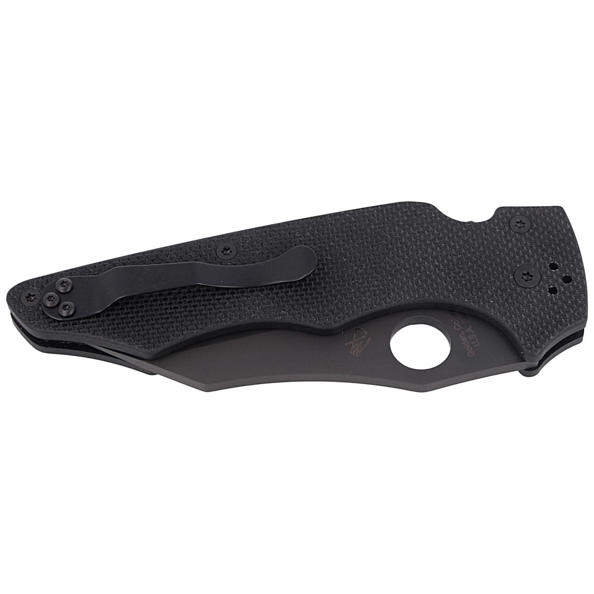 Głownia - o profilu Wharncliffe, grubości 3.7 mm, pokryta czarną powłoką DLC (Diamond-Like Carbon). Ostrze gładkie Plain wyprowadzono szlifem wklęsłym (Hollow Grind). Prosta krawędź tnąca z wklęsłym ostrzem zapewnia wyjątkową wydajność cięcia, przenosząc moc na sztych ostrza i zapewnia lepszą wytrzymałość punktową. Powiększone 14 mm okrągłe wycięcie SpyderHole (patent Spyderco) umożliwia łatwe otwarcie głowni w rękawicy jak i mokrymi, spoconymi dłońmi.