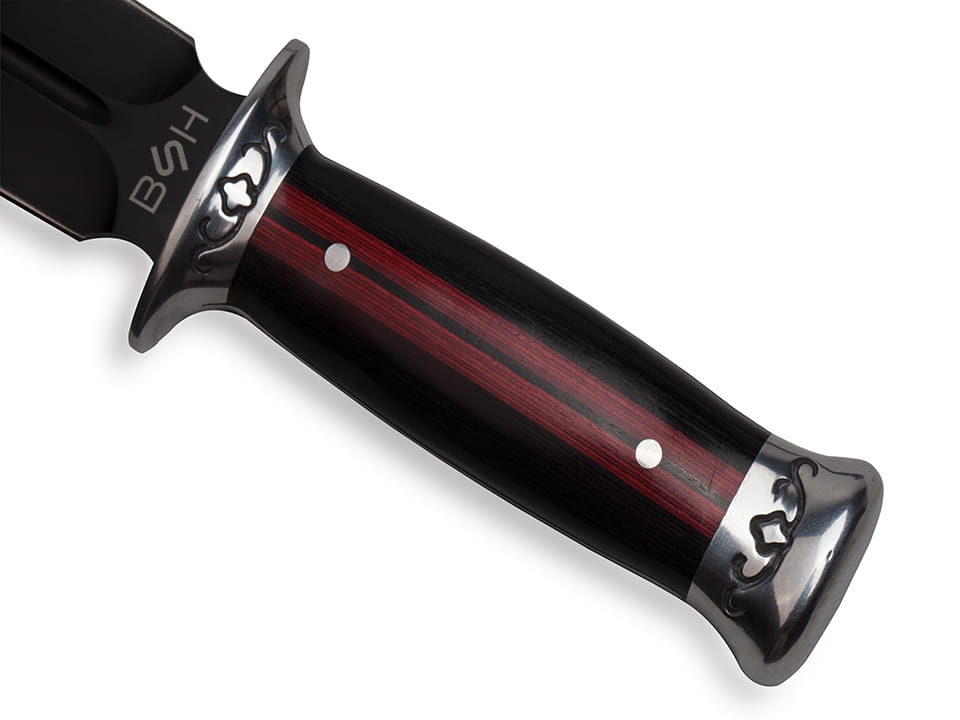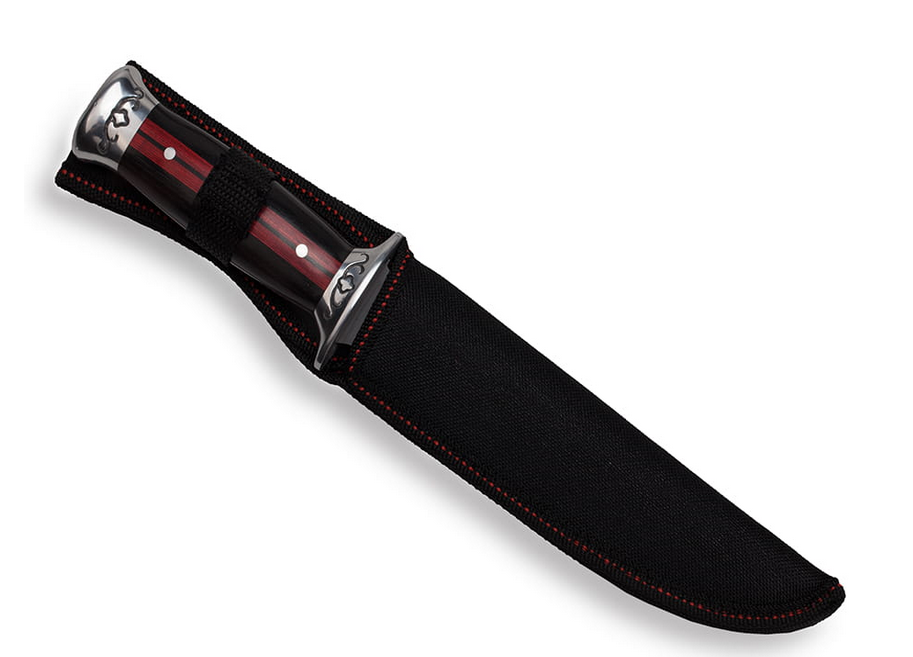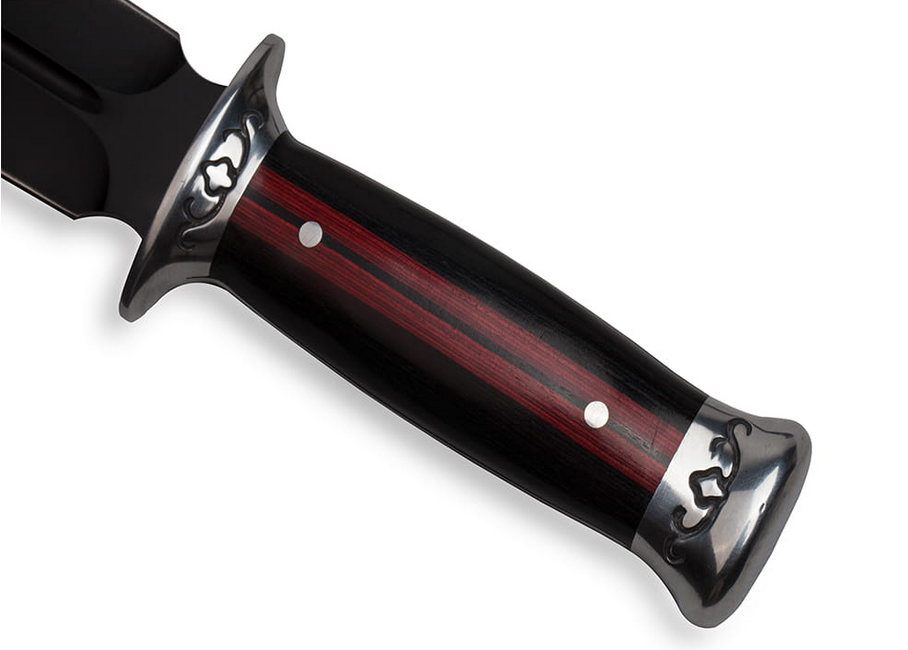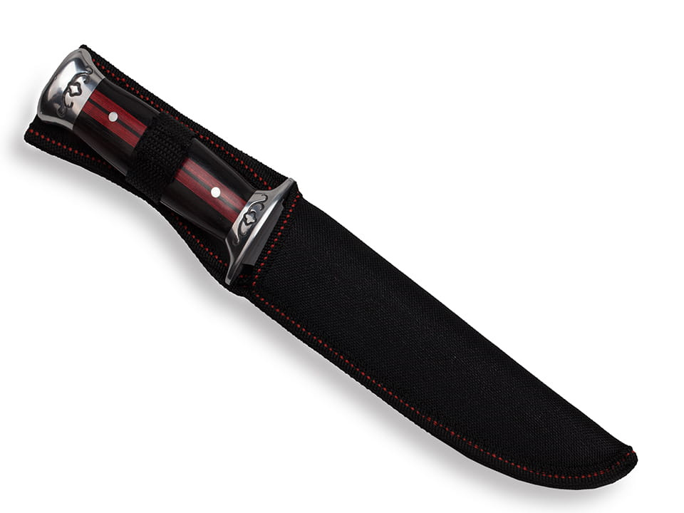 Okładziny rękojeści są wykonane z drewna poddanego obróbce i solidnie zamocowane do metalowego szkieletu. Aby zachować ich strukturę i piękny czarno-czerwony kolor, zalecamy przechowywanie noża w suchym miejscu i unikanie długotrwałego moczenia w wodzie.