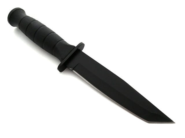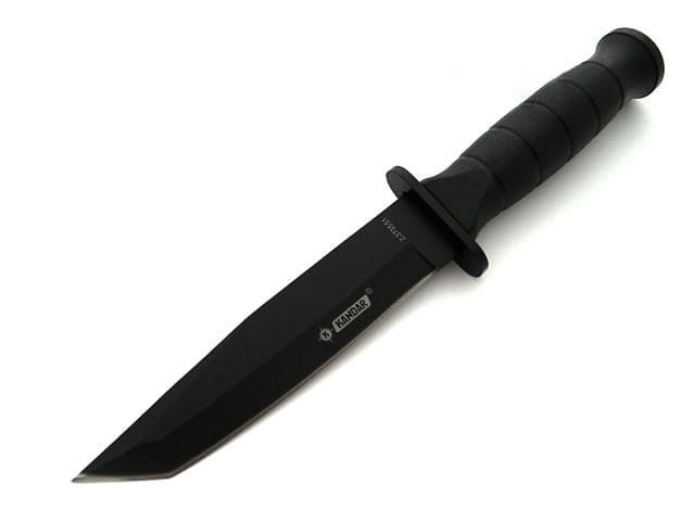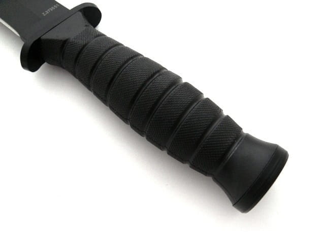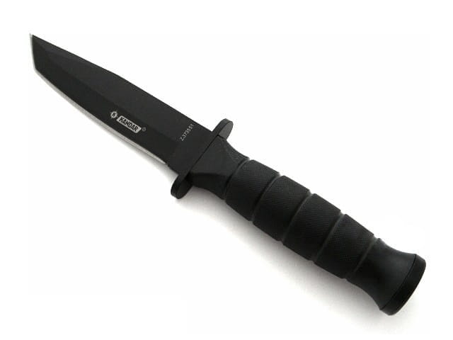 Nóż wojskowy posiada ergonomiczną rękojeść z metalu i antypoślizgowego tworzywa.