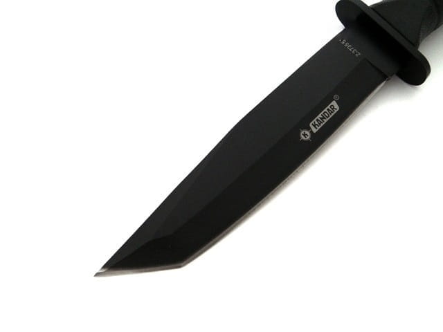 Czarny nóż taktyczny został wyposażony w stalowy jelec, który zabezpiecza dłoń przed zsunięciem się w stronę krawędzi tnącej.