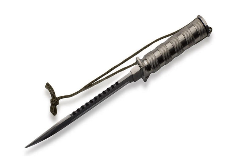 Rękojeść wykonana z czarnego metalu w której wnętrzu znajduje się skrytka na mały zestaw survivalowy.
