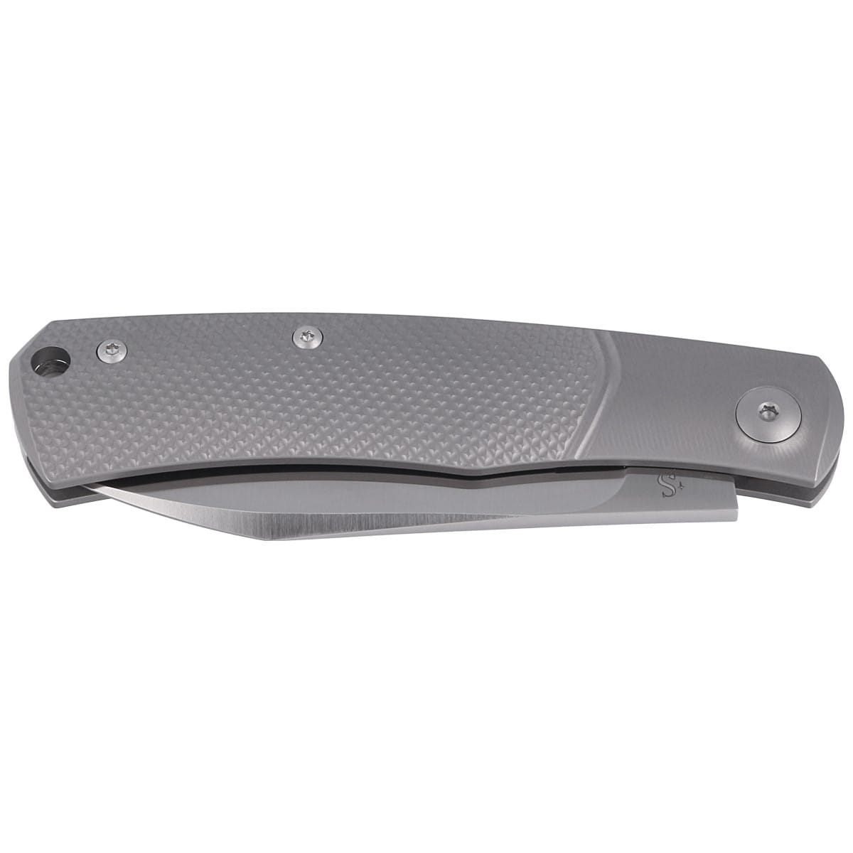 Hug Titanium Geometric, Satin wyposażony w mechanizm SlipJoint lekki folder stworzony z myślą o łatwym użytkowaniu i przenoszeniu. Projekt francuskiego producenta noży customowych Sachy Thiel'a. Smukłe, stylowe okładziny rękojeści z geometryczną teksturą oraz nadające agresywny wygląd i zwiększające funkcjonalność noża, zmodyfikowane ostrze Wharncliffe.
