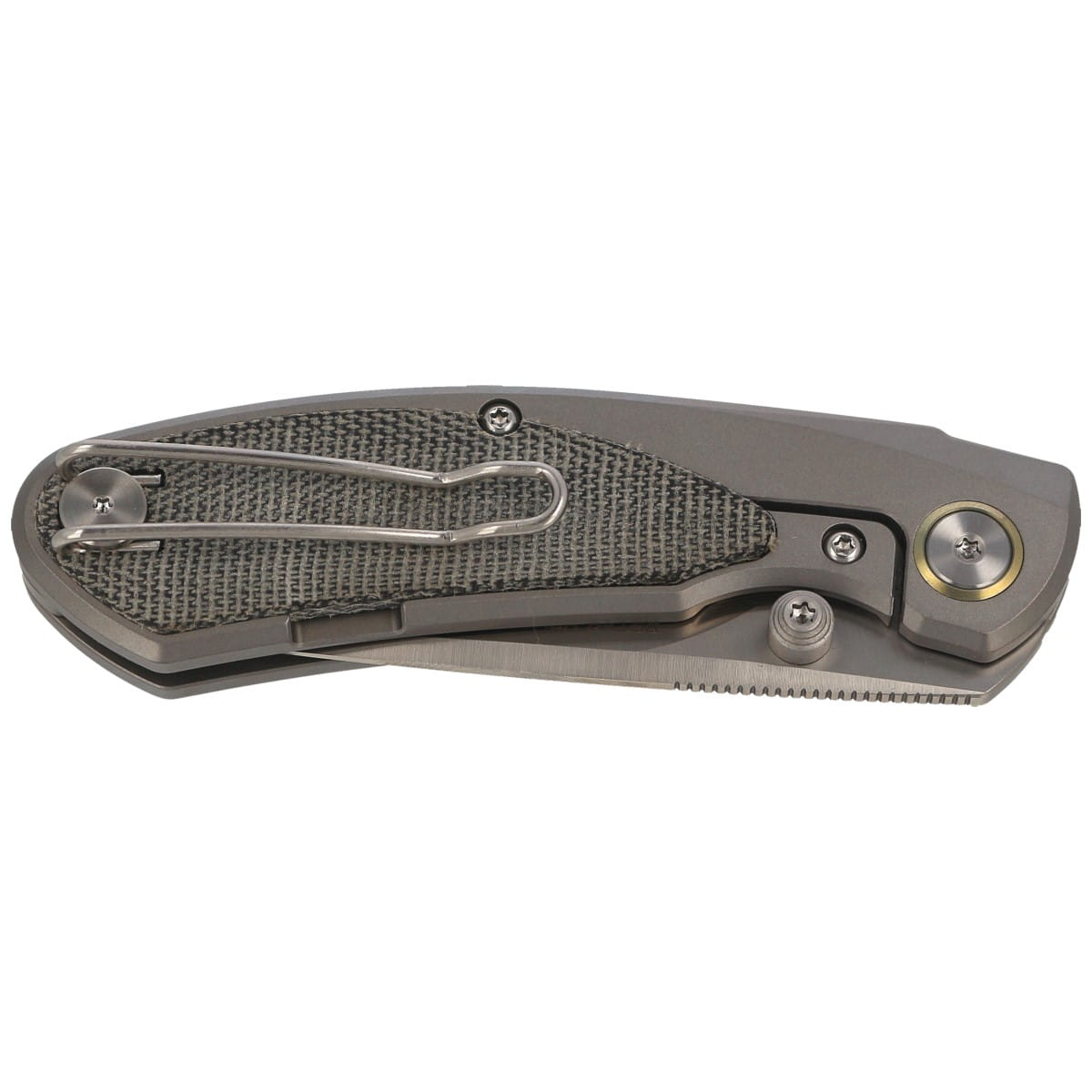 Rękojeść - to dwa kawałki litego tytanu 6AL4V z inkrustacjami z Black Canvas Micarty. Fazowane krawędzie okładek eliminują ostre ranty dla wygody i poprawiają pewność uchwytu. Masywny tytanowy backspacer do którego przymocowano okładziny gwarantuje sztywność i wytrzymałość całej konstrukcji. Oś pivota zdobi tytanowy, barwiony na złoto collar ring. Obustronny (prawa/lewa) klips umożliwia przenoszenie noża w pozycji tip-up, czubkiem ostrza ku górze.