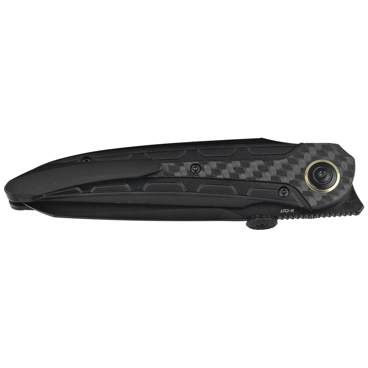 Rękojeść - to dwa kawałki litego tytanu 6AL4V z efektownymi wstawkami (inlay) wykonanymi z kompozytu Carbon Fiber. Fazowane krawędzie okładek eliminują ostre ranty dla wygody i poprawiają pewność uchwytu. Otwarta konstrukcja tzw. open-backed redukuję wagę oraz ułatwia czyszczenie. Jednopozycyjny, prawostronny tytanowy klips umożliwia przenoszenie noża w pozycji tip-up, czubkiem ostrza ku górze.
