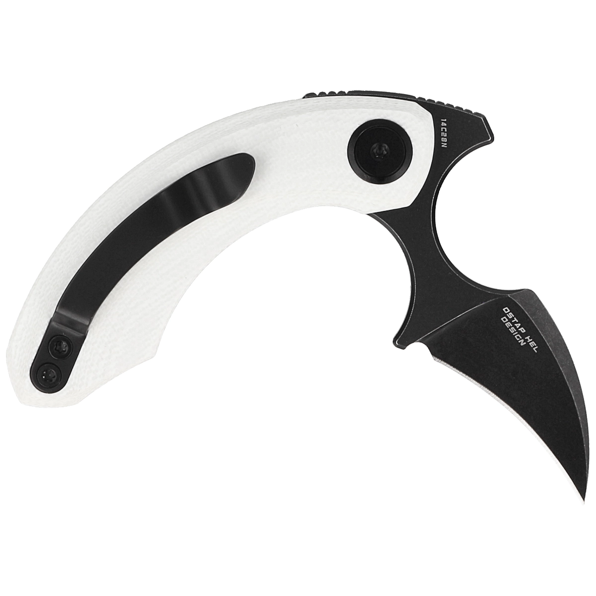 Głownia - typu Hawkbill z maskującym rysy wykończeniem Stonewashed pokrytym czarną powłoką. Wklęsła krawędź tnąca zbiega się w kierunku ostrego jak igła czubka noża. Grubość klingi zapewnia wysoką wytrzymałość podczas gdy wysoki, płaski szlif daje doskonałą geometrię krawędzi tnącej oraz ekstremalną wydajność cięcia. Ceramiczne łożyska kulkowe wspomagają otwarcie ostrza za pomocą szybkiej płetwy flippera (index-finger flipper). Całość blokowana jest sprawdzoną i popularną blokadą liner lock. Po otwarciu, przewężenie tuż za głownią pozwala wygodnie uchwycić nóż zaciśniętą ręką, w pozycji push-dagger. Ostrze wystaje wtedy spomiędzy palców niczym drapieżny szpon!