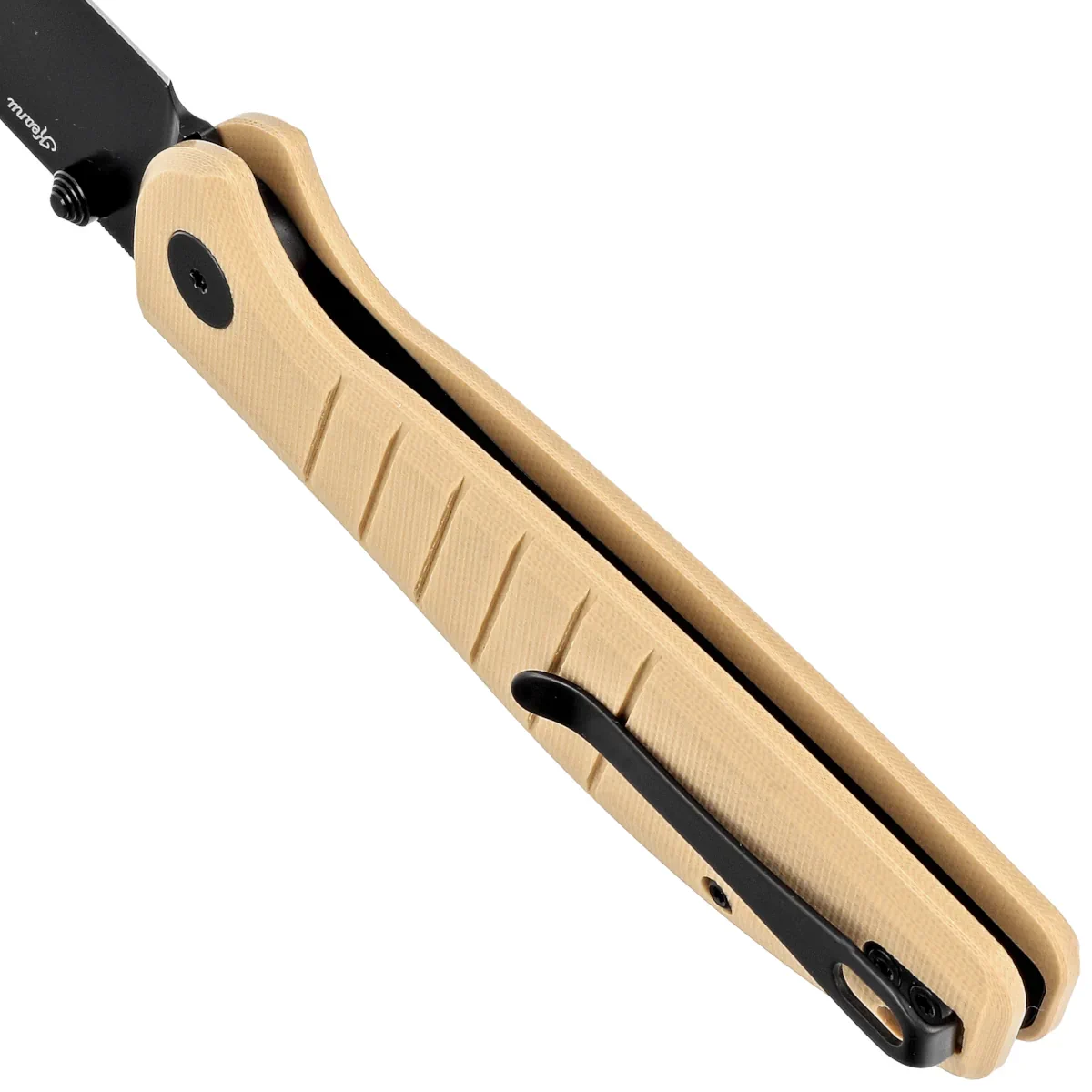 Rękojeść - wykonana z G10, kompozytowego materiału z włókna szklanego prasowanego pod ciśnieniem z syntetyczną żywicą. Agresywna tekstura okładzina zapewnia pewny chwyt, nawet mokrymi dłońmi. Fazowane krawędzie okładek eliminują ostre krawędzie dla wygody, a wykonany z przodu podcięcie na palec poprawia ergonomię. Otwarta konstrukcja tzw. open-backed mocowana stalowymi tulejami dystansowymi redukuję wagę oraz ułatwia czyszczenie. Dwupozycyjny, prawo/lewostronny klips deep carry pozwala przenosić dyskretnie nóż w kieszeni w pozycji tip-up (czubkiem ostrza ku górze).