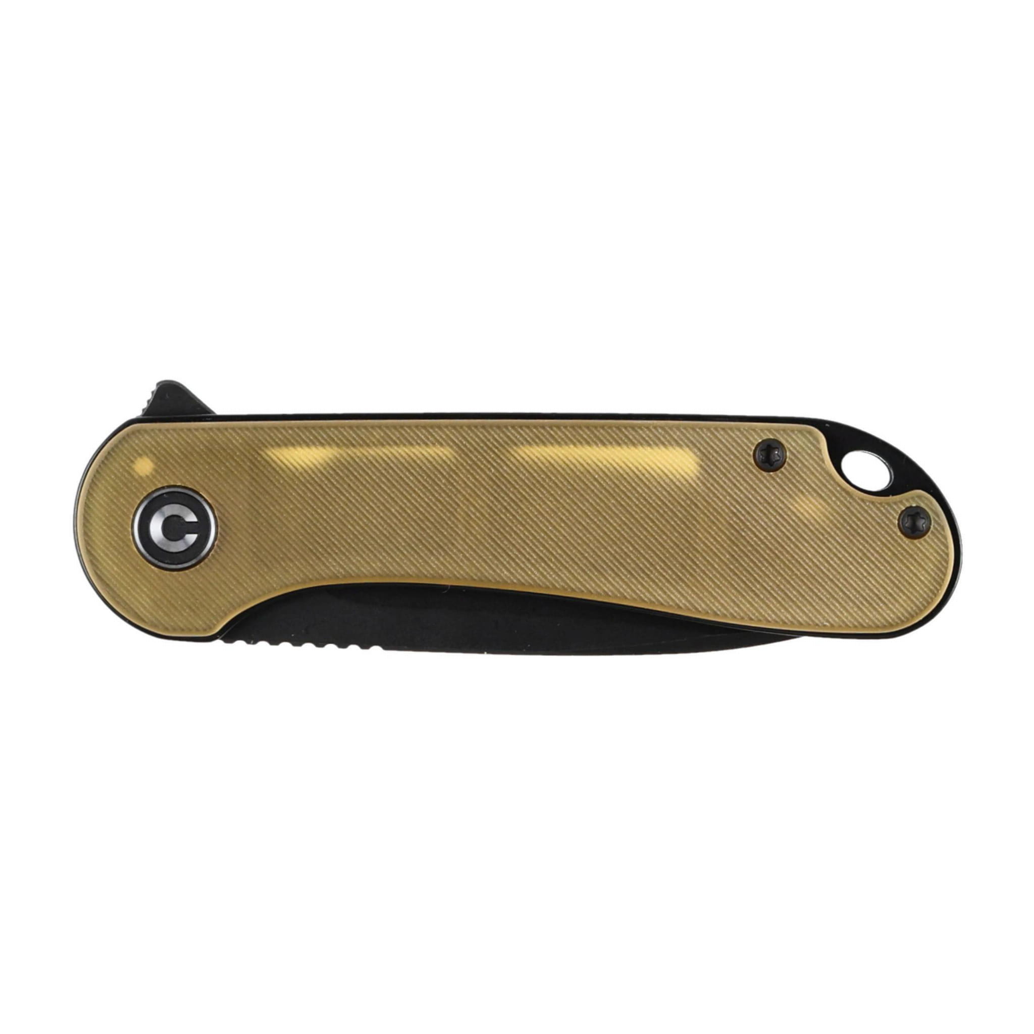 Okładziny noża Civivi Elementum wykonane zostały z materiału Ultem w złotym kolorze. Jest to polieteromoid cechujący się niezwykłą wytrzymałością zarówno na czynniki atmosferyczne jak i wysoką temperatujrę do 180 ºC. Charakteryzuje się ion rónież wysoką odpornością na uszkodzenia mechaniczne oraz działanie substancji chemicznych takich jak rozpuszczalniki, smary lub inne środki chemiczne. Otwarta konstrukcja (ang. open backed) sprawia, że nóż można czyścić i oliwić bez większych problemów.