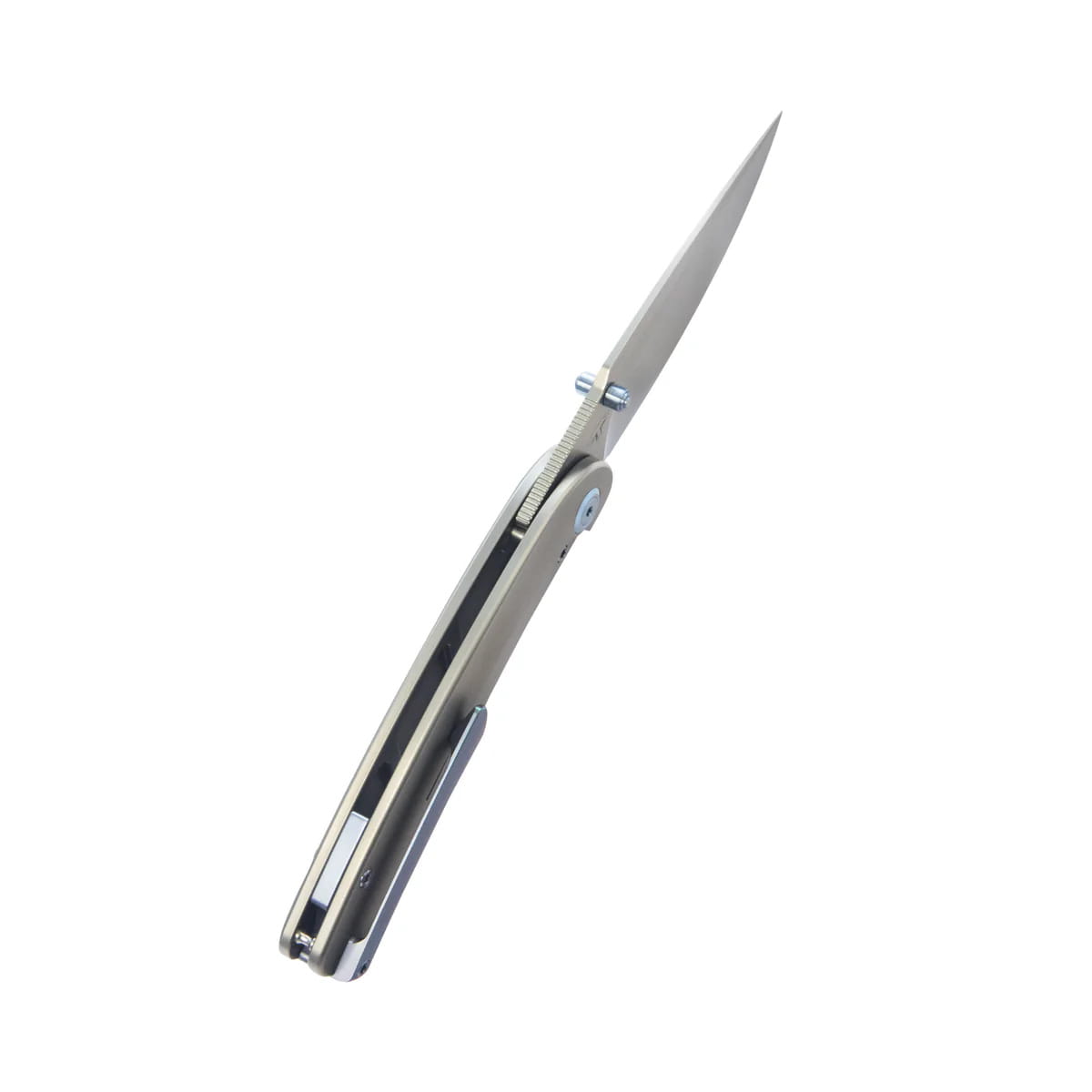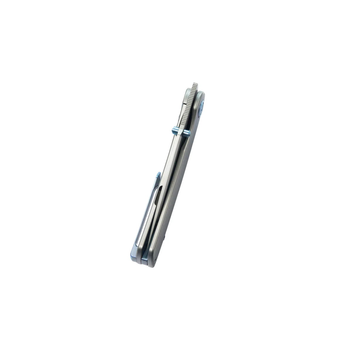 Rękojeść - okładziny z tytanu 6AL4V, materiału niezwykle wytrzymałego mechanicznie i praktycznie całkowicie odpornego na warunki atmosferyczne i działanie chemikaliów, teksturowana drobnym frezowaniem dla poprawienia uchwytu. Całość skręcona do solidnego backspacera, również wykonanego z tytanu 6AL4V. Prosta, solidna konstrukcja daje pewność wieloletniego użytkowania. Oś pivota zdobi nakładka z tytanu (Pivot Cap) w kontrastowym kolorze. Jednopozycyjny (prawa) tytanowy klips deep carry pozwala przenosić dyskretnie nóż w kieszeni w pozycji tip-up (czubkiem ostrza do góry). Ukryte w backspacerze miejsce na mocowanie linki zabezpieczającej lub ozdobnej.