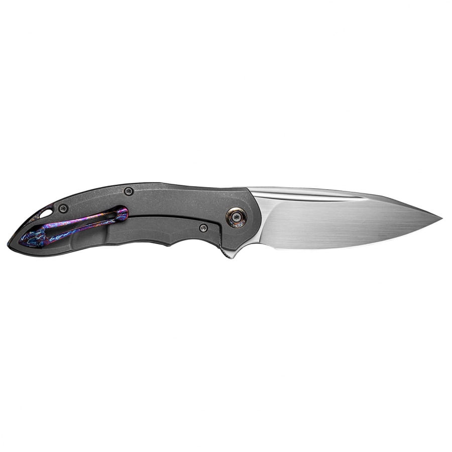 Głownia noża wykończono ręcznie elegancką techniką satynowania. Wydatny brzuch zwiększa długość krawędzi tnącej, co wpływa na efektywność i płynność cięcia. Grubość klingi 3,2 mm zapewnia wysoką wytrzymałość, podczas gdy wysoki, płaski szlif nadaje doskonałą geometrię krawędzi tnącej oraz wydajność cięcia. Ceramiczne łożyska kulkowe wspomagają otwarcie ostrza za pomocą płetwy flippera, pełniącej po otwarciu ostrza funkcję jelca zabezpieczającego dłoń przed zsunięciem się na ostrze. Klinga jest blokowana monolityczną blokadą frame-lock ze stalową wkładką zabezpieczającą przed wycieraniem czoła blokady. Okładziny noża wykonano z anodyzowanego na szaro tytanu z karbonowymi wkładkami. Konturowanie okładzin eliminuje ostre krawędzie i zwiększa wygodę użytkowania noża. Okładziny połączono ze sobą przy pomocy tytanowego backspacera. Matowa tekstura powierzchni poprawia pewność uchwytu. Tytanowy jednopozycyjny klips z tytanu, umożliwia przenoszenie noża w pozycji tip-up (czubkiem do góry).