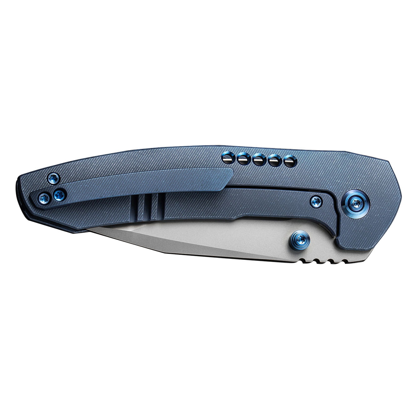 Głownię WE Trogon wykuto ze stali CPM-20CV, doskonale trzymającej krawędź i odpornej na korozję. Klingę typu Spear Point, zahartowaną do 59-61 HRC i wykończoną metodą Bead Blast, otwiera się za pomocą kołka pod kciuk. Rękojeść wykonano z barwionego na niebiesko tytanu. Całość blokuje sprawdzony mechanizm Frame Lock.